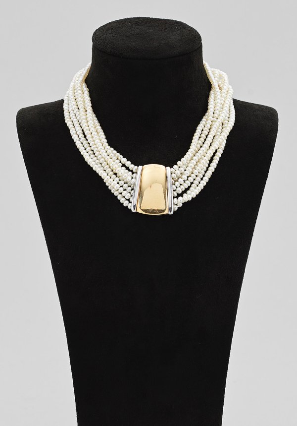 Gelb- und Weißgold, gest. 750. 7-reihige Kette aus weißen Boutonperlen in sehr farbintensivem, rosé-grün changierendem Lüster, trapezförmige Schließe. Herstellerzeichen.