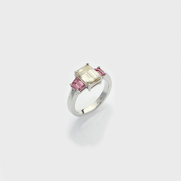 Weißgold, 750. Zentral besetzt mit einem Diamanten von ca. 2,90 ct. (K-L/vs) im Emerald-Variationcut, flankiert von Fancy pinkfarbenen Diamantbaguetten von zus. ca. 1,10 ct. (vs-si). Gew. ca. 6,50 g.