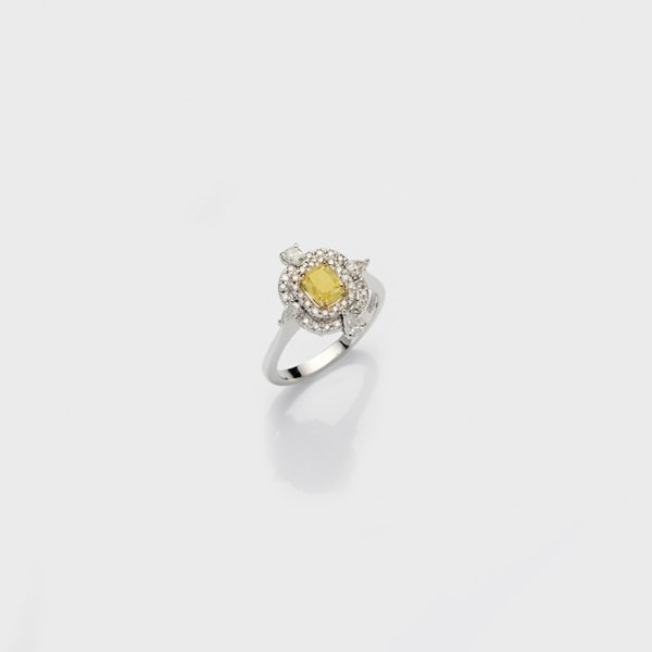 Weißgold, gest. 750. Zentral besetzt mit einem Fancy Intense Yellow-Diamanten von ca. 1,01 ct., entouriert von Brillanten von zus. ca. 1,00 ct.; Gew. ca. 4,99 g.