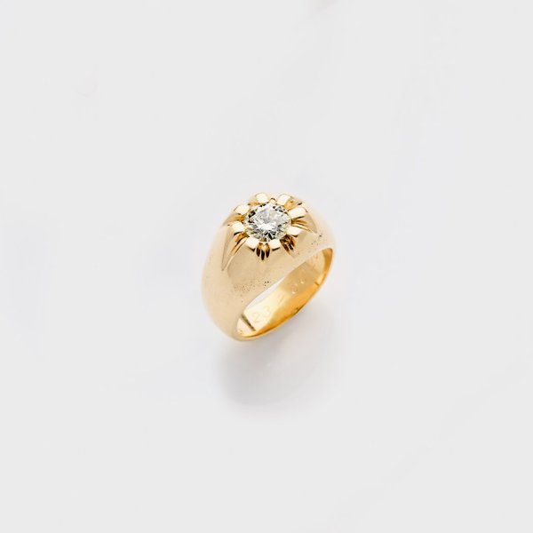 Gelbgold, gest. 750. Zentral besetzt mit einem Brillantsolitär von ca. 1,48 ct. (J-K/LR-vvs). Gew. ca. 23,14 g.;