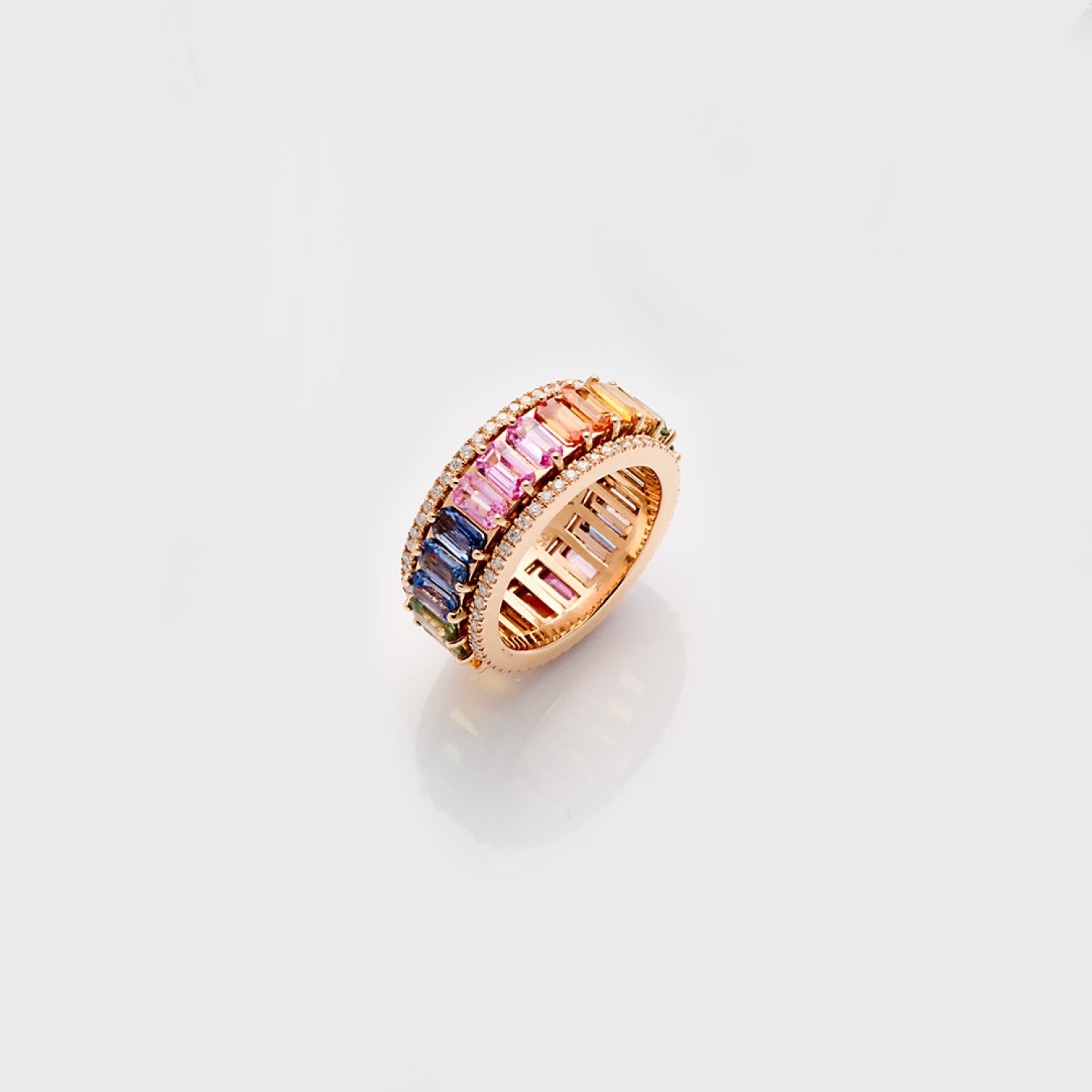 Roségold, gest. 750. Innere drehbare Ringschiene schauseitig besetzt mit natürlichen Saphiren in den Farben Orange, Lemon, Goldgelb, Pink, Kornblumenblau, Purple und Petrolgrün von zus. ca. 7,06 ct., entouriert von Brillanten von zus. ca. 0,65 ct. (F/vs1). Gew. ca. 12,70 g.