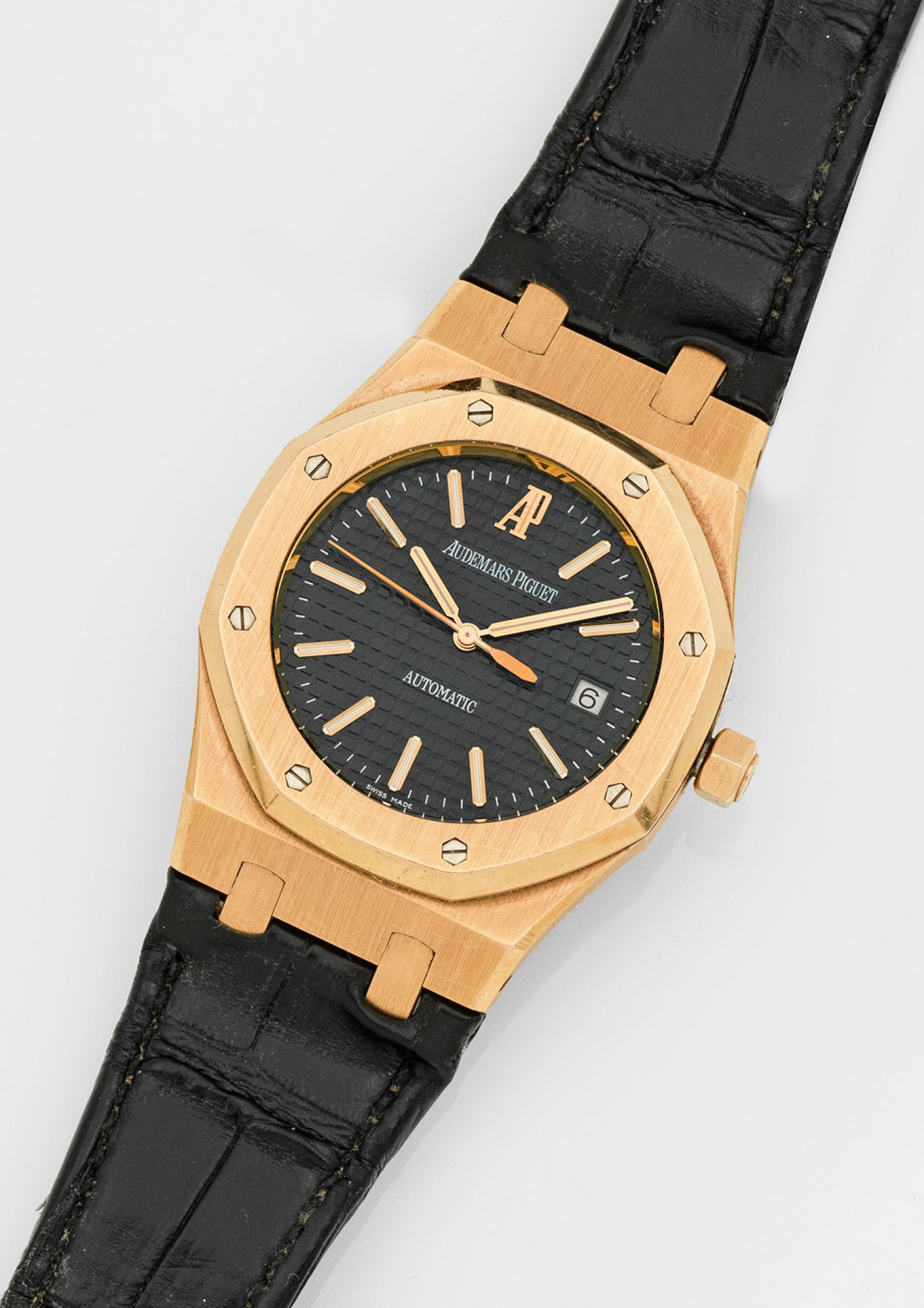 Roségold, gest. 750. Oktogonales Uhrengehäuse, Zifferblatt mit schwarzem "Grande Tapisserie"-Muster, goldenen Indexen und Zeiger mit Tritiumauflage, Datumsanzeige, verglaster Boden. Saphirglas. Schwarzes Krokodil-Lederarmband mit Gold-Faltschließe aus 750er Roségold. Automatikwerk mit Selfwinding-Nr. 2360/G 23109. Herstellerzeichen. Gew. ca. 116,20 g.