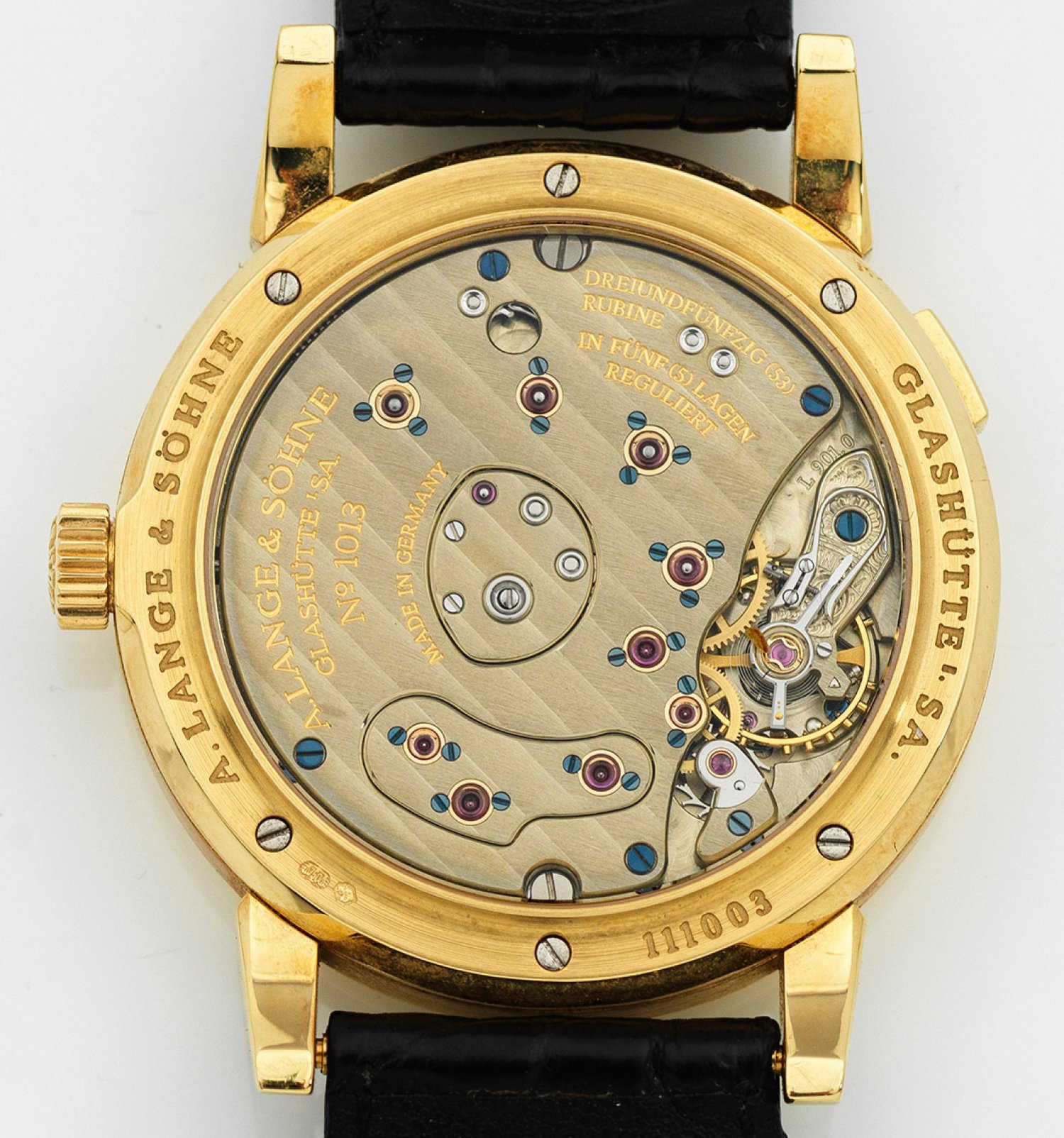 sog. "Lange 1, Auf und Ab". Gelbgold, gest. 750. Rundes Uhrengehäuse, Silber gekörntes Zifferblatt, aufgesetzte Indexe sowie römische Ziffern in Schwarz, gebläute Lanzenzeiger, Großdatumsanzeige zwischen der Zwölf und der Eins, kleine Sekunde zwischen der Fünf und der Sechs und Stundenanzeige auf der Neun, auf der Vier separate Gangreserve. Verglaster Boden, Saphirglas. Automatikwerk mit seitlichem Kronenaufzug. Schwarzes Krokodil-Lederarmband mit Gold-Dornschließe. Herstellerzeichen. Gew. ca. 100,59 g. Uhrenbox und Zertifikat. Nahezu neuwertig.