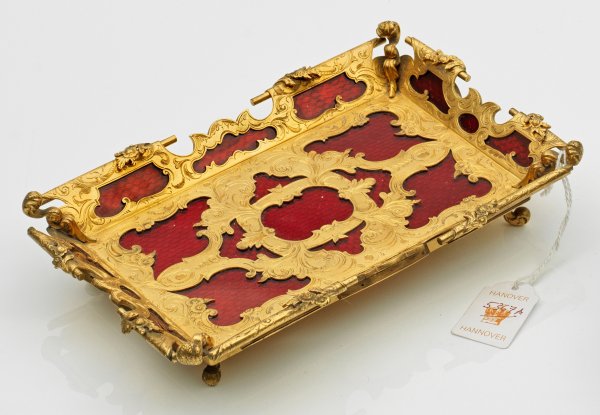 Bronze, vergoldet und teilw. emailliert. Rechteckiges Tablett über vier kurzen Volutenfüßen. Spiegel und ansteigende Fahne üppig verziert mit ziselierten Blatt- und Blütenranken sowie Voluten. Kartuschenförmige Aussparungen hinterlegt mit verglastem, wellenförmig guillochiertem und blutrot emailliertem Grund. Der Rand durchbrochen gearbeitet und dekoriert mit reliefplastisch aufgelegten Blüten. H. 4,5 cm. 21,5 cm x 14 cm.