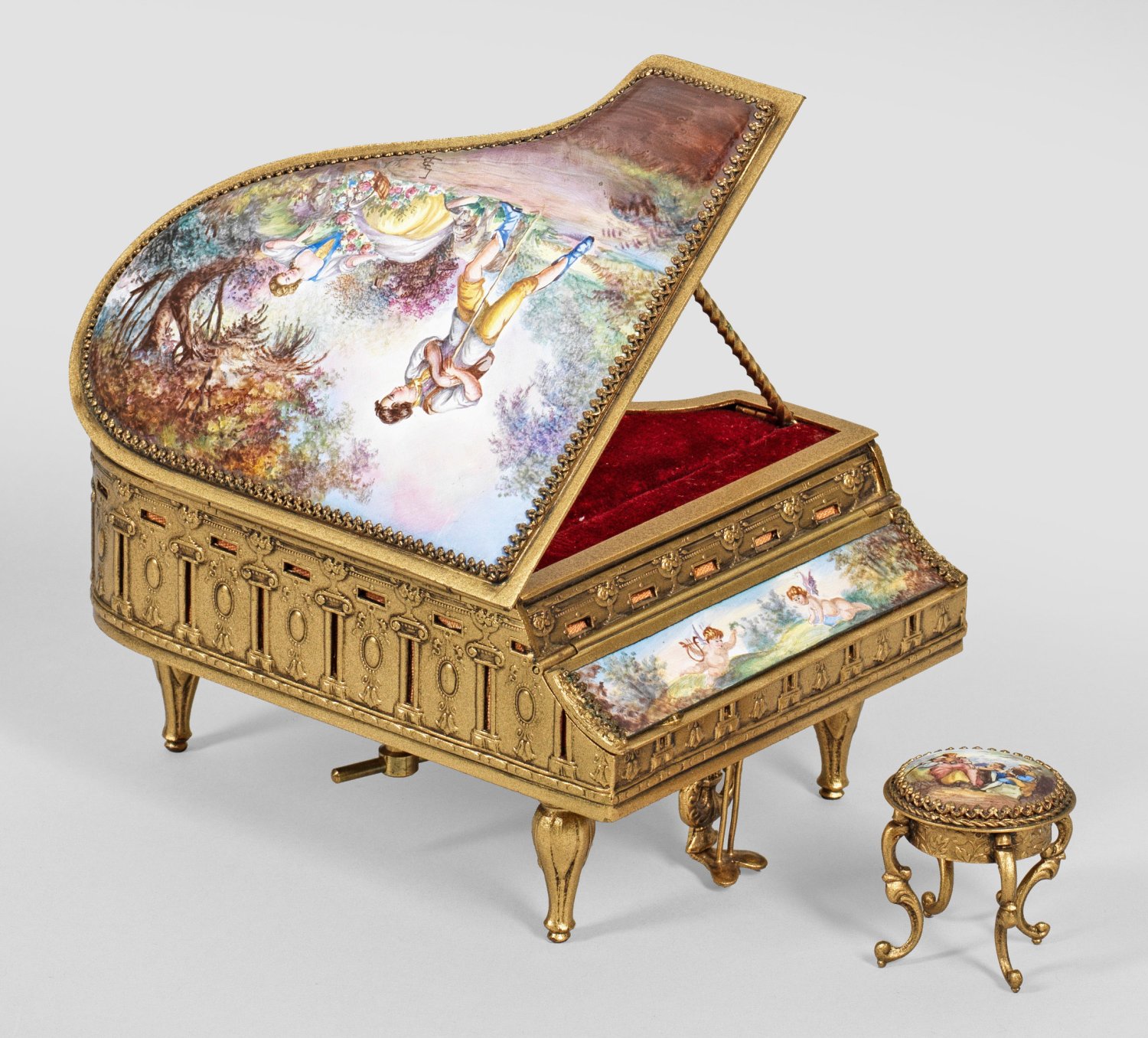 Bronze, vergoldet und teilw. emailliert. Vollplastisch ausgearbeitete Spieldose in Form eines Konzertflügels auf drei konischen Beinen mit kleinem, rundem Hocker. Scharnierter Klavier- und Klaviaturdeckel. Innen ein kleines, mit rotem Samt ausgekleidetes Fach. Wandung umzogen von stilisierten, reliefierten Säulen im Wechsel mit hochovalen Medaillons und Blütenkelchdekor. Die Deckel, die Klaviatur sowie der Hocker verziert mit feiner polychromer Emaillemalerei teilw. mit szenischer Darstellung eines Schäferpaares, Musikanten sowie zwei Putti. Sign. "G (?) B." Auf der Bodenunterseite Aufzug. H. 7,3 cm. 10 cm x 13 cm. Hocker-H. 3,2 cm.