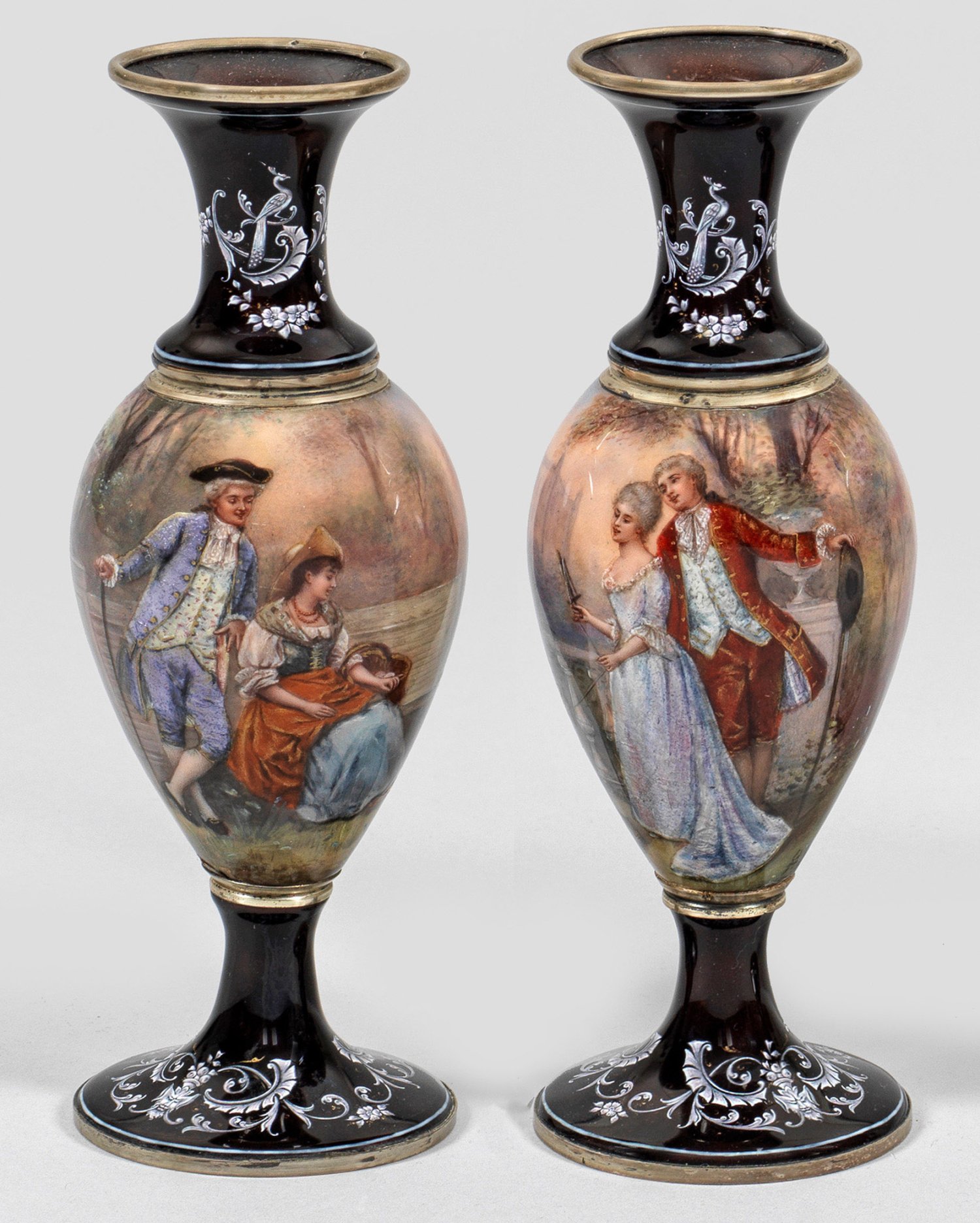 Kupfer emailliert, mit Silbermontierung. Trompetenförmiger Stand, übergehend in hoch ovoiden, schmalen Korpus in eingezogenem Schaft und sich stark erweiterndem Rand endend. Stand und Hals braun emailliert und mit weiß-roséfarbenem, filigranem Blattwerk, Blütenfestons, Pfauen und Maskaronen mit Goldakzentuierung verziert. Der Vasenkorpus mit lieblichen Darstellungen galanter Paare auf einer Bank sitzend sowie beim Spinnen vor baum- und architekturbestandenen Parklandschaften in polychromem Transluzidemaille bzw. lieblichen Lachs- und Rosatönen. Sign. "FC". Minim. Fehlstelle. Gest., undeutl. Beschauzeichen, Meisterzeichen "BW" mittig mit Darstellung eines Posthorns. H. 20 cm.