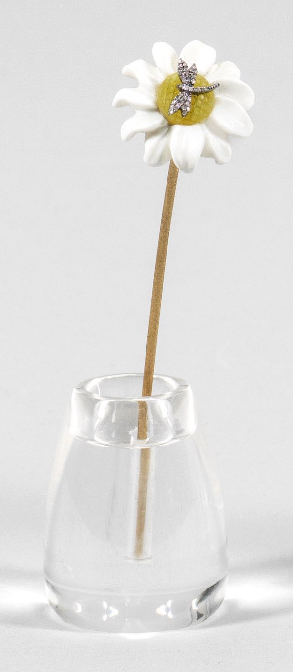 in der Art von Karl Fabergé. Farbloses Glas und Silber, vergoldet. Konischer Topf mit einsetzbarem, schmalem Blütenstängel, bekrönt von einer Blüte aus weißen, geschliffenen Steinen. Zentral eine kleine applizierte Libelle, besetzt mit Diamantrosen. Gest. 88. H. 13 cm.