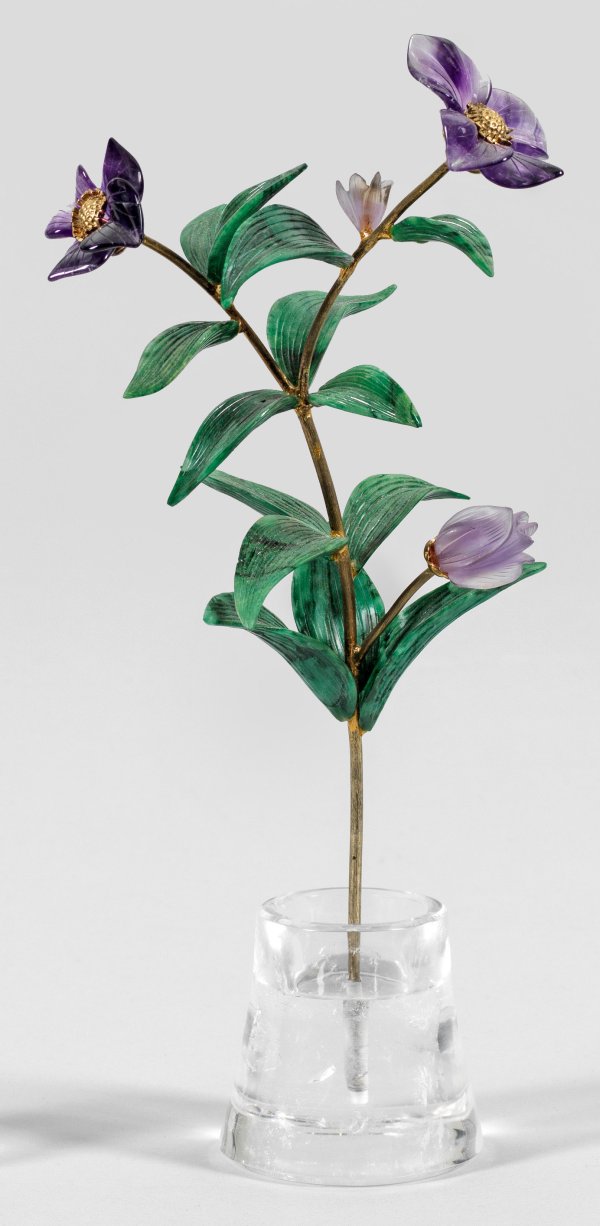 in der Art von Karl Fabergé. Vase aus Bergkristall mit herausnehmbarem Blumenzweig aus vergoldetem Silber, daran Blätter aus Nephrit und Blüten aus Amethyst. Gest. 88. H. 27,5 cm.