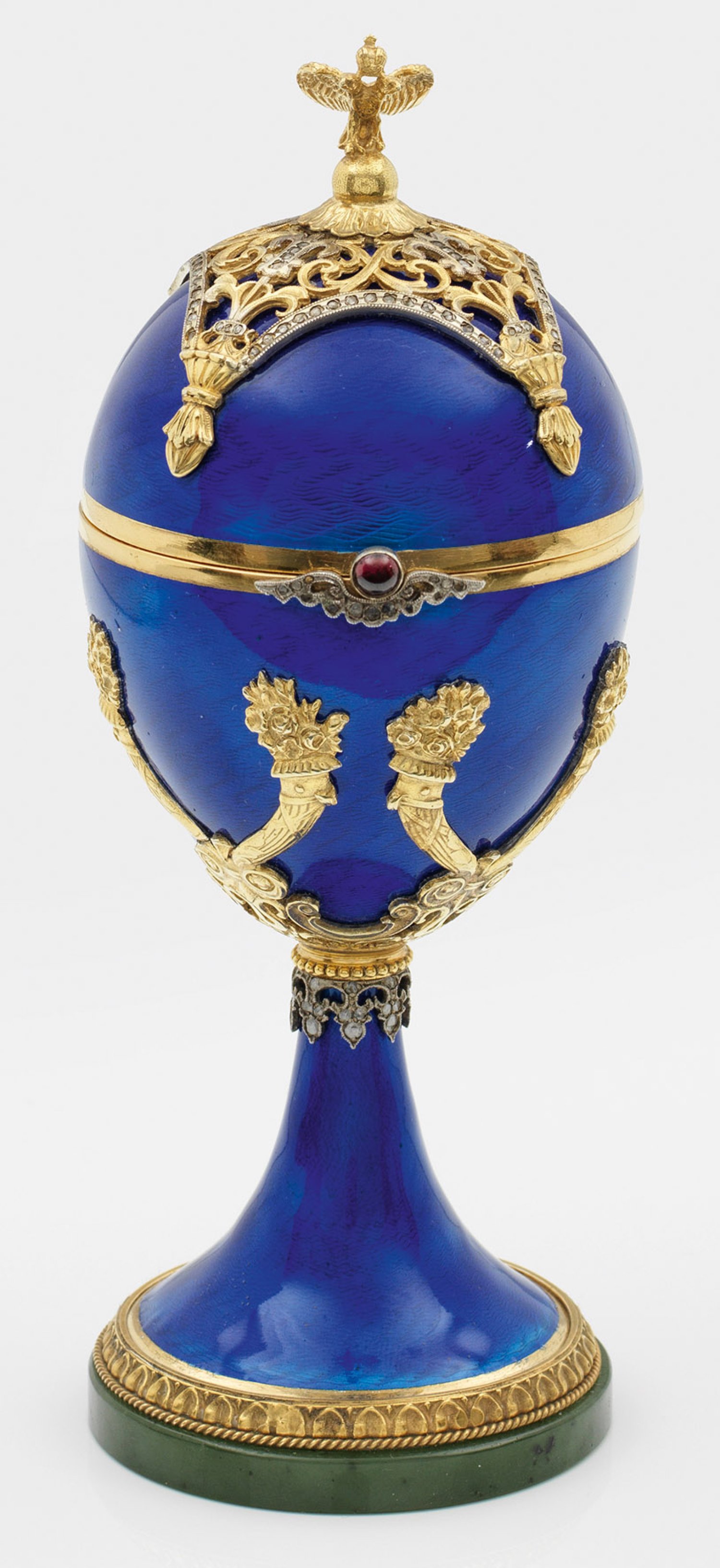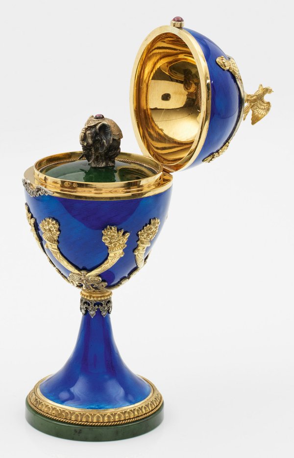 im Stil von Karl Fabergé. Silber, teilw. vergoldet und emailliert. Auf rundem Sockel aus Nephrit trompetenförmiger Schaft mit reliefiertem Blätterfries. Ovoider, blau emaillierter und wellenförmig guillochierter, scharnierter Korpus. Reiche, durchbrochen gearbeitete Applikationen in Form von Füllhörnern und Blüten, C-Schwüngen und Voluten. Als Knauf vollplastischer, bekrönter Doppeladler über einem aufgelegten Ornament aus reliefierten Voluten, teilw. ausgefasst mit Diamantrosen. Innen eine naturalistisch gearbeitete Elefanten-Miniatur, aus teilw. vergoldetem Silber, geschmückt mit Rubincabochon über einem Grund aus grün-schwarz gemasertem Nephrit. Gest. 88. Gew. 480 g. H. 16,5 cm.