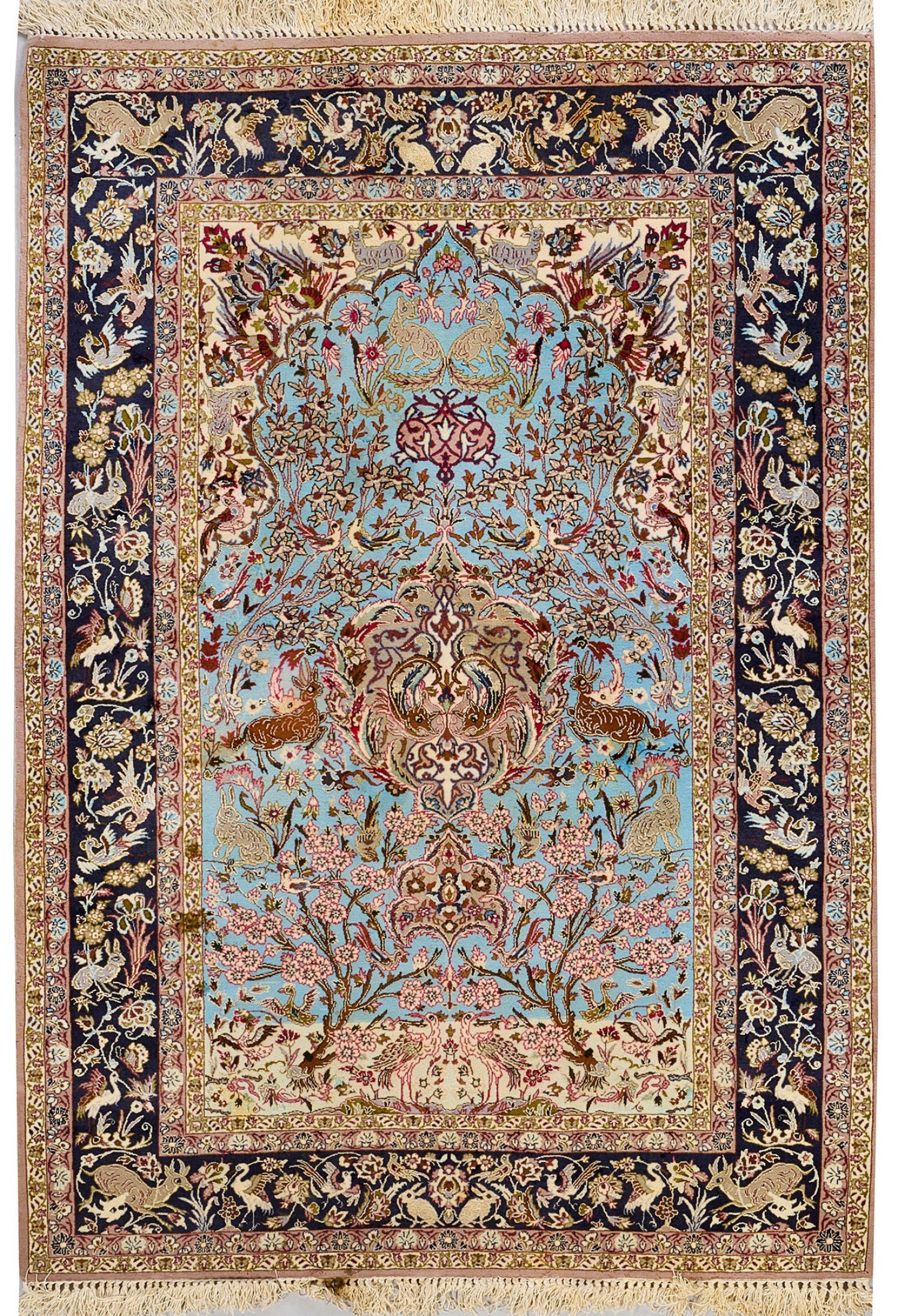 Persien. Korkwolle mit Seide auf Seide. Feine Knüpfung. Auf hellblauem Fond passig geschweifte Gebetsnische mit flächendeckender Paradiesgartenmusterung. Umlaufend breite, dunkelgrundige Bordüre aus Wildtieren, flankiert von schmalen Nebenbordüren. Partiell Fehlstellen. 160 cm x 111 cm.