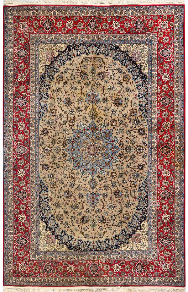 Persien. Korkwolle mit Seide auf Seide. Sehr feine Knüpfung. Im beigefarbenen, ovalen Innenfeld Zentralmedaillon mit Anhängern in hellblau. Flächendeckende Musterung aus arabesk angeordneten Palmettenranken. Umlaufend breite, hellrote Palmettenbordüre, flankiert von schmalen Bändern. 306 cm x 204 cm.