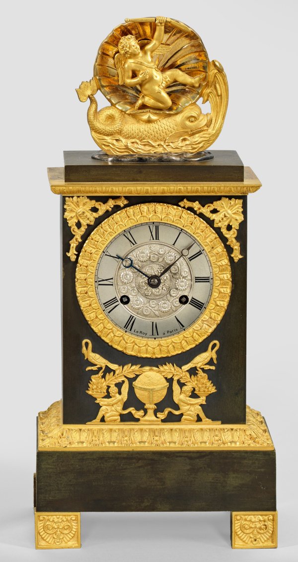 Bronze, patiniert und teilw. vergoldet. Hochrechteckiges, gestuft ansteigendes Uhrengehäuse mit breitem Palmettenfries sowie erhaben reliefierten Putten. Reliefplastische Bekrönung in Gestalt von Amor in einer Muschel auf einem Delphin reitend. Umlaufend breit profiliertes Zifferblatt, bez. Le Roy à Paris. Pendulenwerk mit Fadenaufhängung sowie Halbstundenschlag auf Glocke. Stundenzeiger fehlt. H. 39,5 cm. 18 cm x 9 cm.