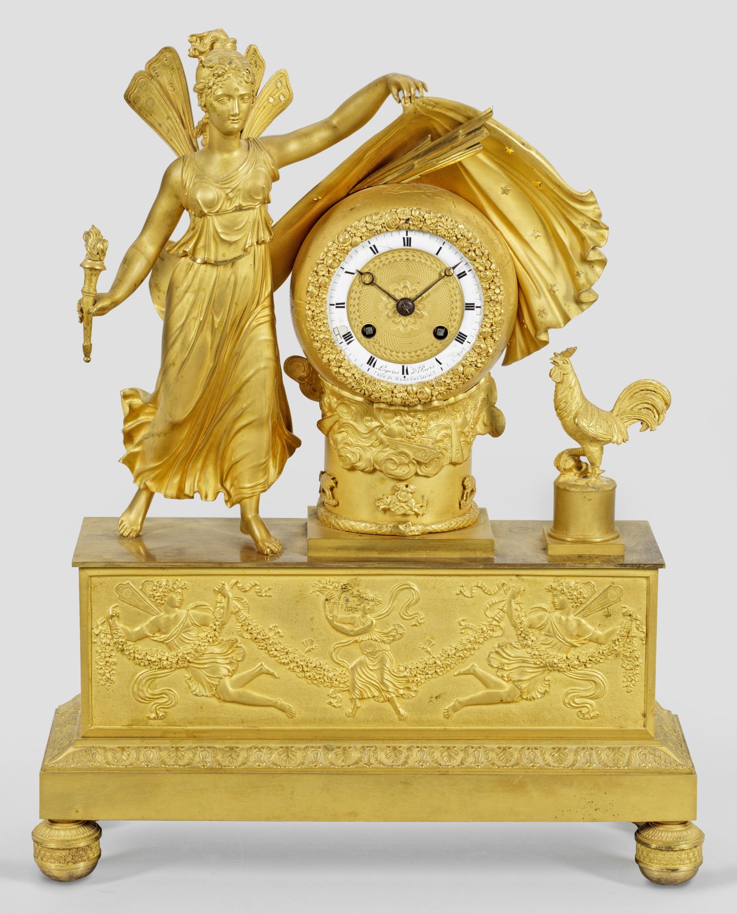 Bronze, vergoldet. Über querrechteckig angelegtem Sockel mit Palmettenfries und reliefierter Darstellung von Genien mit Festons vollplastische Darstellung der römischen Göttin Aurora mit Fackel, den Schleier der Nacht hebend und einen neuen Tag enthüllend. Rundes Uhrengehäuse mit besch. Emailziffernring bez. Legras à Paris. Pendulenwerk mit Fadenaufhängung sowie Halbstundenschlag auf Glocke. H. 44 cm. 34 cm x 12 cm.