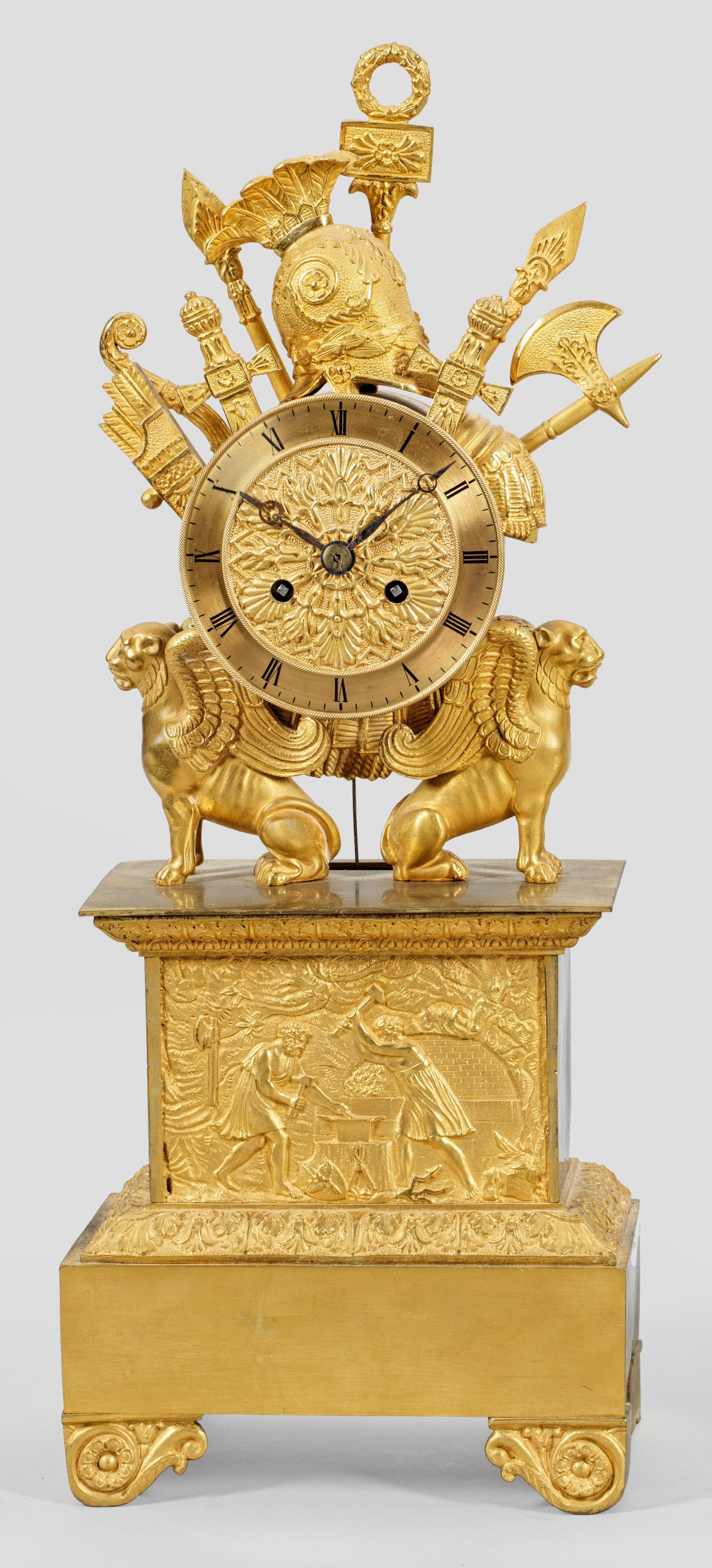 Bronze, vergoldet. Über hohem Podestsockel mit breitem Palmettenfries sowie reliefierter Darstellung der Waffenschmiede Vulkans vollplastische Darstellung von zwei Chimären als Träger für rundes Uhrengehäuse. Bekrönung aus unterschiedlichen Attributen der Kriegskunst. Pendulenwerk mit Fadenaufhängung sowie Schlagwerk auf Glocke. H. 45 cm.