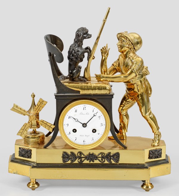 Bronze, vergoldet und teilw. dunkel patiniert. Über gekantetem, gestuft ansteigendem Sockel vollplastische Darstellung eines Knaben mit einem, auf einem Stuhl Männchen machenden Pudel und Jagdgewehr. Profilgerahmtes, besch. Emailzifferblatt bez. Blanc Fils Palais Royal. Pendulenwerk mit Fadenaufhängung sowie Halbstundenschlag auf Glocke. H. 35,5 cm. 32 cm x 11 cm.