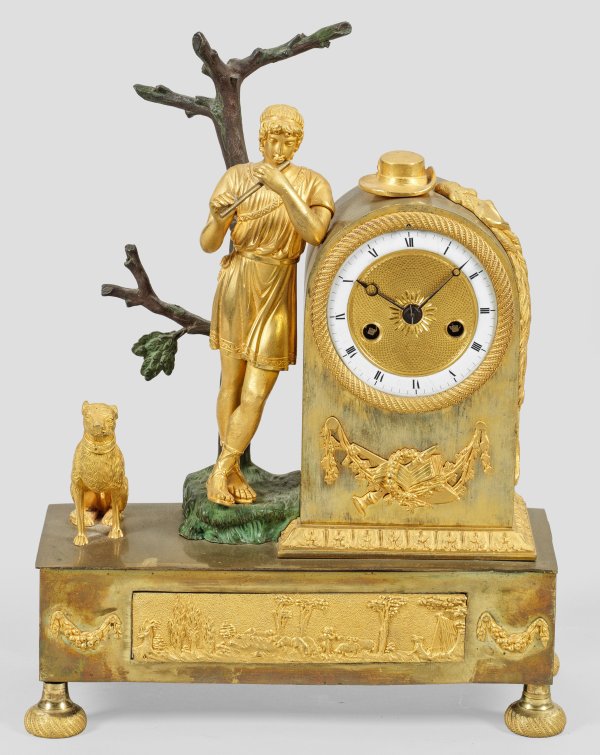 Bronze, vergoldet und teilw. kalt patiniert. Über querrechteckig angelegtem Sockel mit eingelassenem Fries, vollplastische Darstellung eines antikisierenden Hirtenknaben beim Flötenspiel. Gerundetes Uhrengehäuse mit profilgerahmten Emailziffernring. Pendulenwerk mit Fadenaufhängung sowie Halbstundenschlag auf Glocke. Ergänzungen. H. 33,5 cm. 25,5 cm x 10 cm.