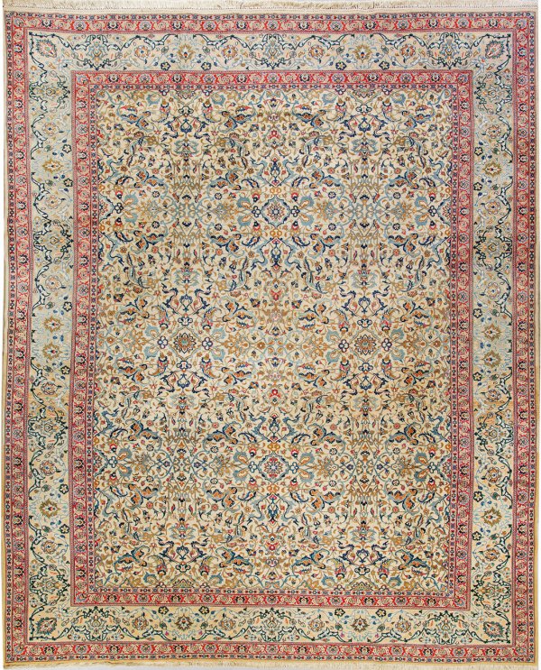 Persien. Um 1950. Wolle auf Baumwolle. Im cremefarbenen Innenfeld flächendeckende Musterung aus dicht angeordneten Ranken. Umlaufend korrespondierende Palmettenbordüre, flankiert von hellroten Bändern 394 cm x 310 cm.