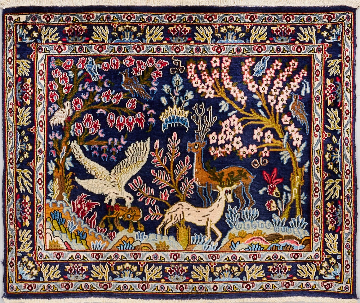 Persien. Wolle auf Baumwolle. Im dunkelblauen Innenfeld flächendeckende Bildfläche aus unterschiedlichen Bäumen, Vögeln und Wildtieren. Umlaufend mehrteilige Bordüre in korrespondierender Farbigkeit. 86 cm x 73 cm.