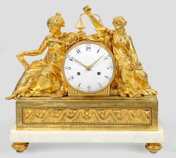 Bronze, vergoldet und weißer Marmor. Über querrechteckig angelegtem, gestuft ansteigendem Sockel mit breitem Wellenfries, vollplastische Darstellung der Justitia mit Waage und Richtschwert sowie ihr gegenüber allegorische Figur mit Schlange und Tafel als Sinnbild für die Rhetorik und Dialektik. Verglastes Emailzifferblatt sowie Pendulenwerk mit Fadenaufhängung und Halbstundenschlag auf Glocke. H. 41 cm. 42 cm x 12 cm.