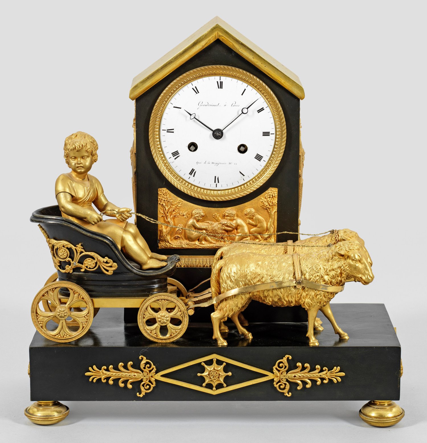 Bronze, vergoldet und teilw. dunkel patiniert. Über querrechteckig angelegtem Sockel vollplastische Darstellung eines Kindes in einem von Schafen gezogenem Wagen. Dahinter architektonisch gegliedertes Uhrengehäuse mit korrespondierendem Relief. Profilgerahmtes Emailzifferblatt bez. Granvoinnet à Paris. Pendulenwerk mit Fadenaufhängung sowie Halbstundenschlag auf Glocke. Rest.; H. 39 cm. 37 cm x 18 cm.