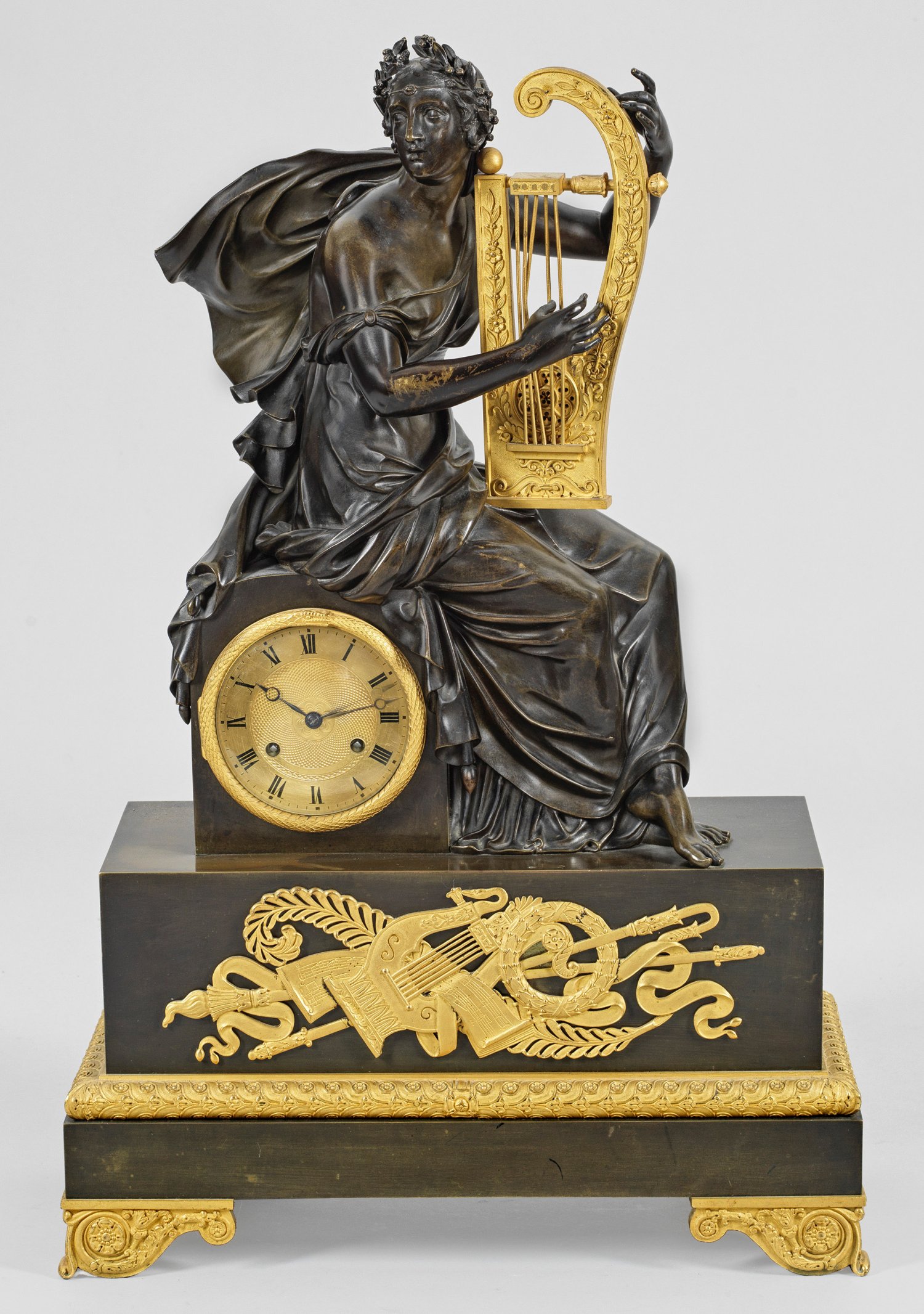 Bronze, dunkel patiniert. Über querrechteckig angelegtem Sockel mit breitem Fries aus Wellenband sowie applizierten Attributen der Musik. Oberhalb rechteckiges Uhrengehäuse sowie vollplastische Darstellung der Muse Terpsichore mit Lyra. Verglastes, guillochiertes Zifferblatt sowie Pendulenwerk mit Fadenaufhängung und Halbstundenschlag auf Glocke. H. 64 cm. 42 cm x 14,5 cm.