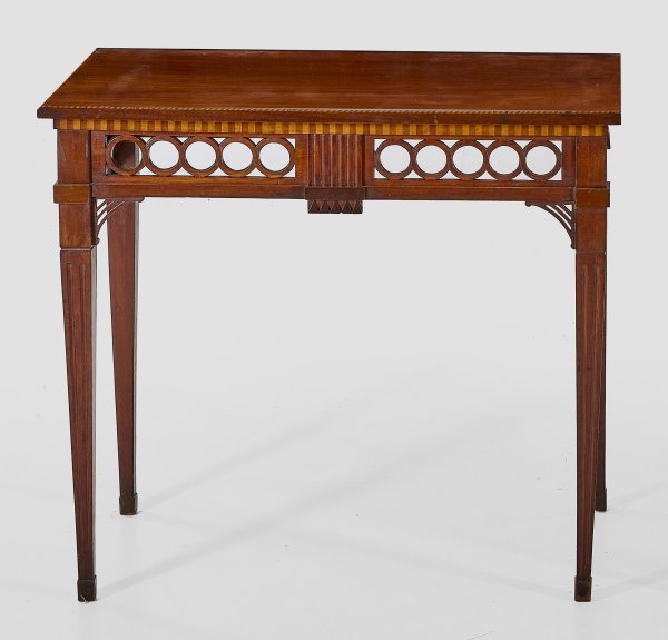 Mahagoni, massiv und furniert. Gerade, durchbrochen gearbeitete Zarge auf konischen, teilw. kannelierten Vierkantbeinen mit gebogten Streben. Gering überstehende, rechteckige Deckplatte mit schmaler bandschattierter Kante. H. 74 cm. 81,5 cm x 43 cm.