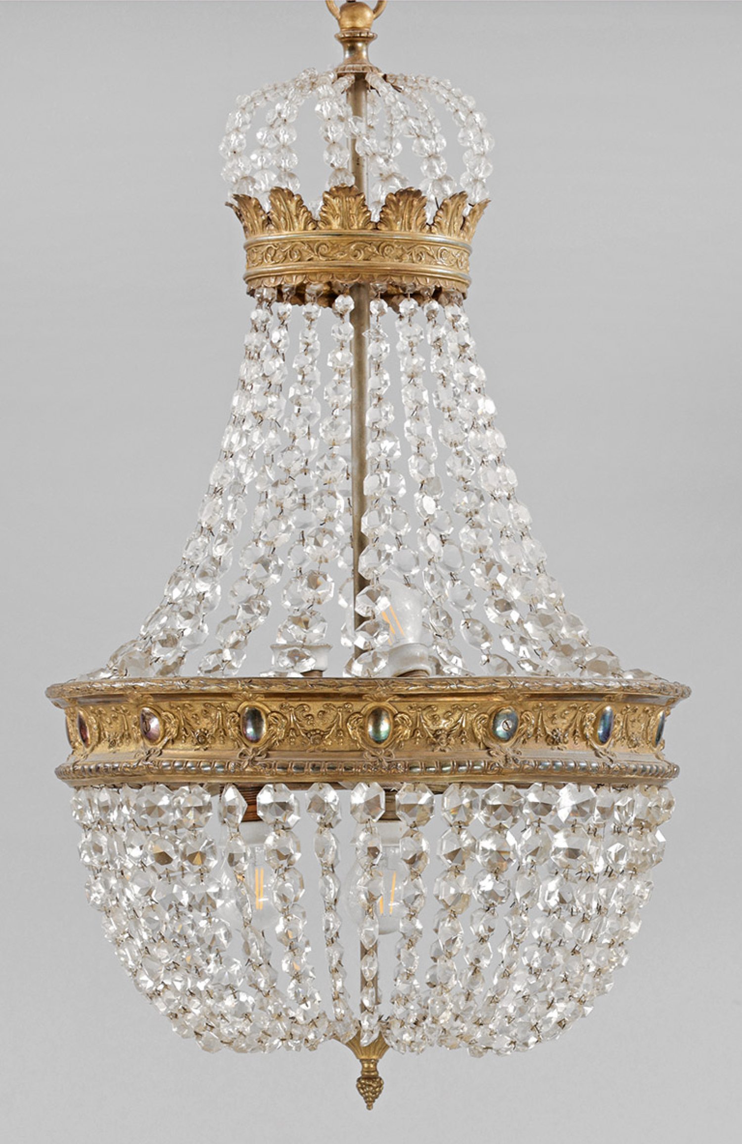 Messing und farbloses Glas. Balusterförmiger Korpus aus Prismenschnüren im Verlauf. In der Mitte breiter, fein ornamentierter Reif. Oberer Abschluss in Form einer großen Bügelkrone. Innen fünf Lampenfassungen. Elektrifiziert. H. 90 cm. D. 50 cm.
