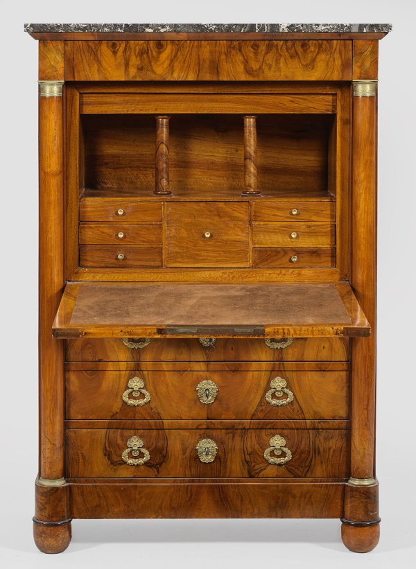 Nussbaum, furniert. Gerader, hochrechteckiger Korpus, flankiert von eingestellten Halbsäulen auf gerundeten Füßen. In der gegliederten Front vier, teilw. vorkragende Schubladen unterschiedlicher Größe sowie abklappbare Arbeitsfläche. Dahinter gestaffelte Facheinteilung. Deckplatte aus anthrazitfarbenem, hell gemasertem Marmor. H. 141,5 cm. 98 cm x 43 cm.