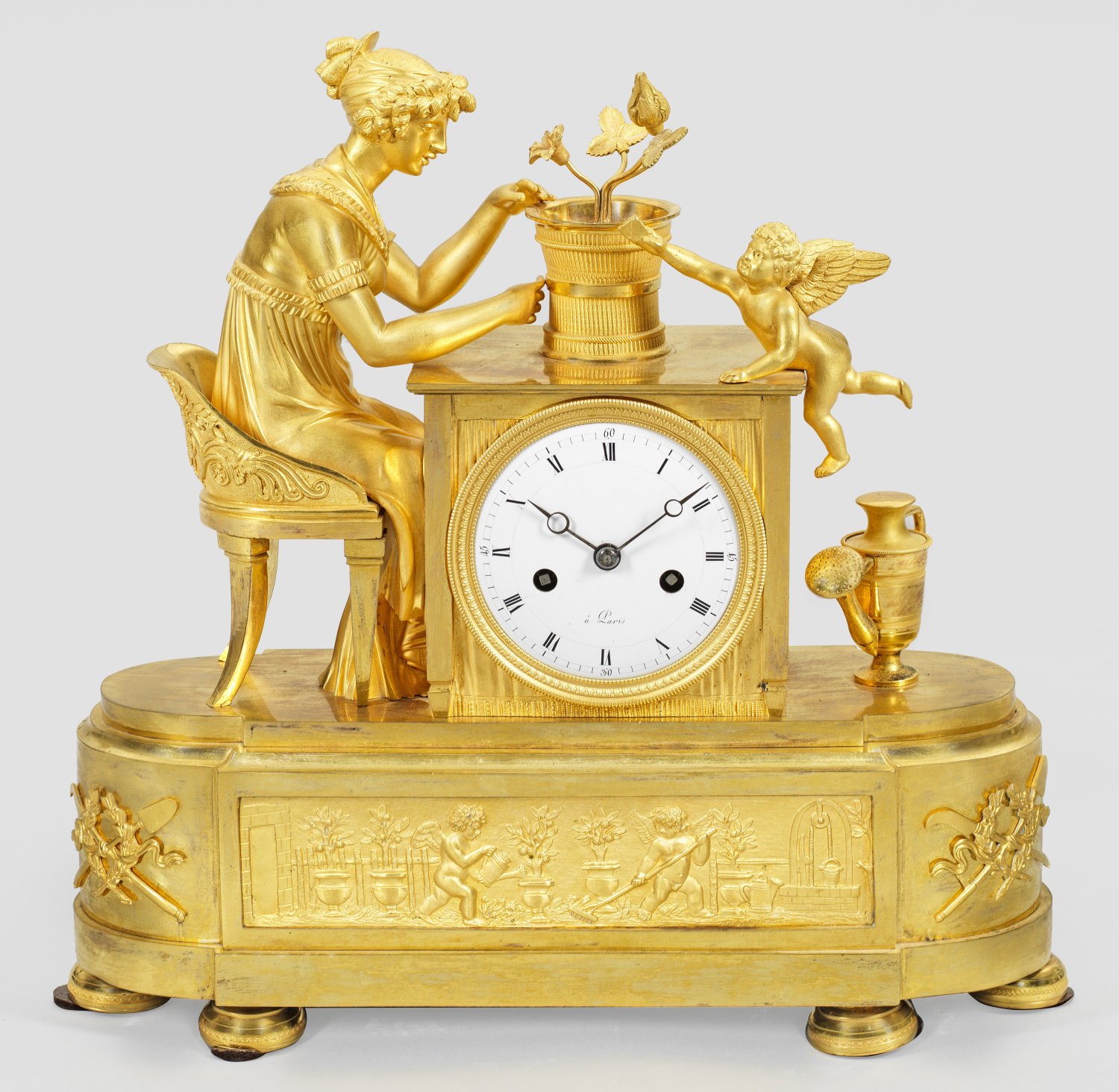 Bronze, vergoldet. Über gestuft ansteigendem Sockel mit breitem, szenisch angelegten Fries aus gärtnernden Amoretten, gekantetes, tischähnliches Uhrengehäuse mit vollplastischer Darstellung einer jungen Dame in einem Gondelsessel bei der Pflanzenpflege sowie kleiner Amorette, ihr einen Brief überbringend. Profilgerahmtes Emailzifferblatt bez. à Paris sowie Pendulenwerk mit Fadenaufhängung und Halbstundenschlag auf Glocke. H. 33 cm. 33 cm x 11,5 cm.
