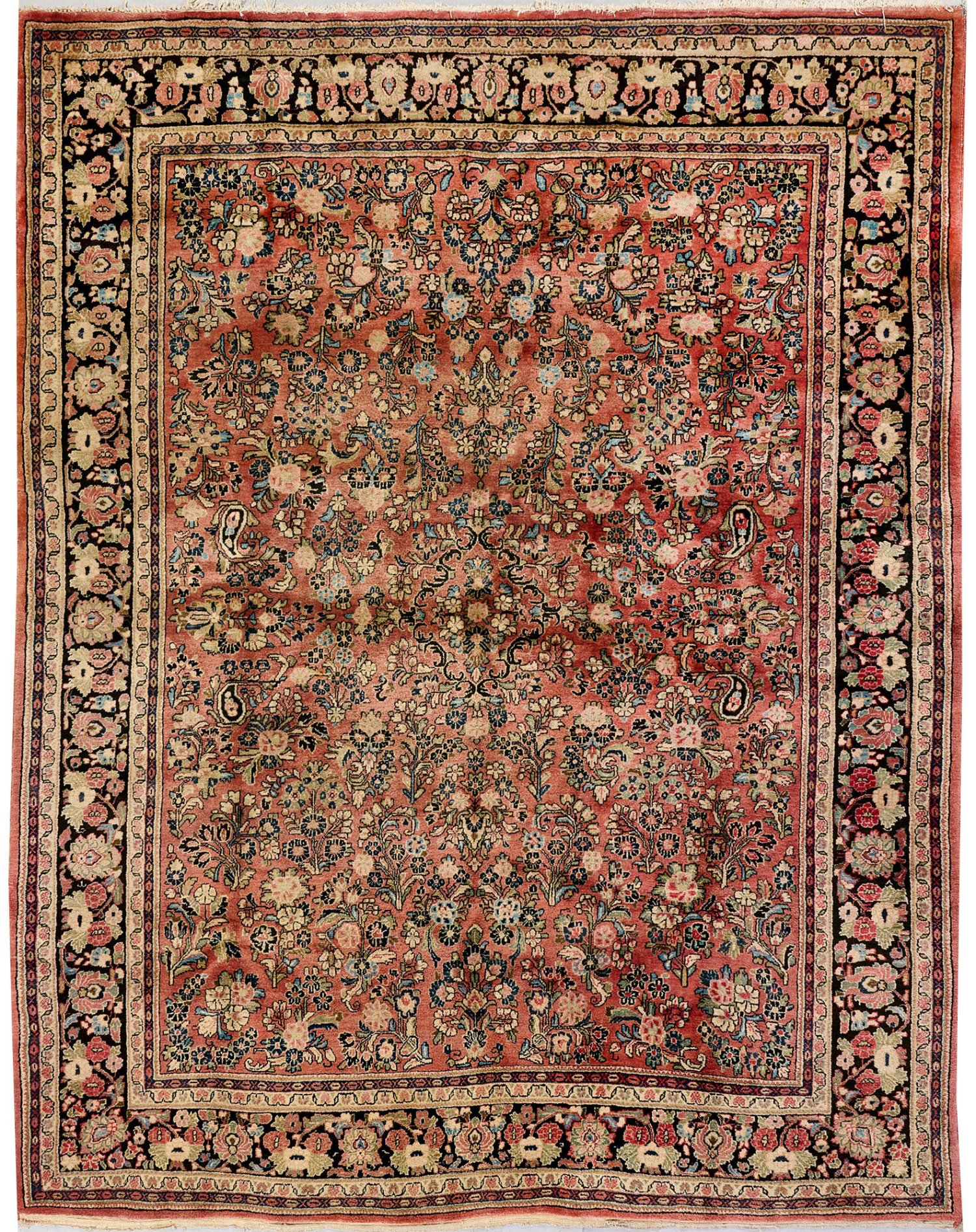 Persien. Mitte 20. Jh.; Wolle auf Baumwolle. Im hellroten Innenfeld flächendeckende Musterung aus dicht angeordneten Blütenrispen und -dolden. Umlaufend dunkelgrundige Palmettenbordüre, flankiert von schmalen Bändern. 308 cm x 250 cm.
