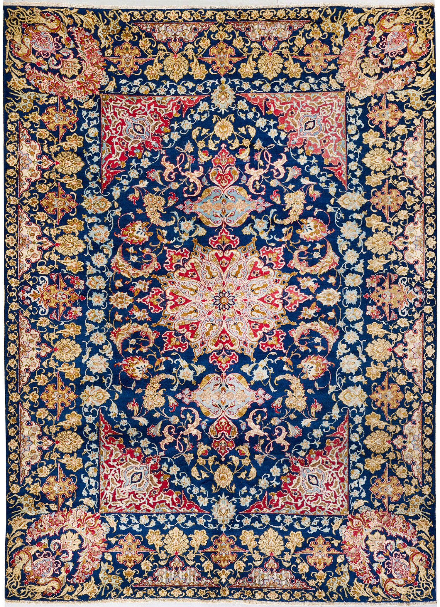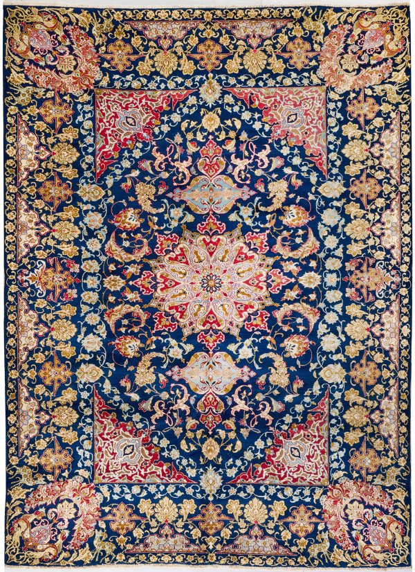 Persien. Mitte 20. Jh.; Wolle auf Baumwolle. Auf dunkelblauem Fond rotgrundiges Zentralmedaillon sowie korrespondierende Ecklösungen. Flächendeckende Musterung aus üppigem Rankenwerk. Umlaufend breite, offen gestaltete Bordüre mit korrespondierender Musterung. 334 cm x 240 cm.