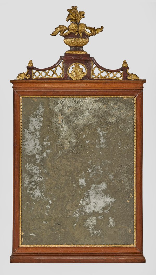 Mahagoni sowie Holz geschnitzt, gefasst und partiell vergoldet. Hochrechteckige, profilierte Spiegelrahmung mit schmalem Gesims sowie durchbrochen gearbeiteter, geschweift ansteigender, oberer Abschluss aus zentralem Blattmotiv, Gitterwerk und großer Vasenbekrönung. Altes Spiegelglas mit starken Altersspuren. 118 cm x 63 cm.