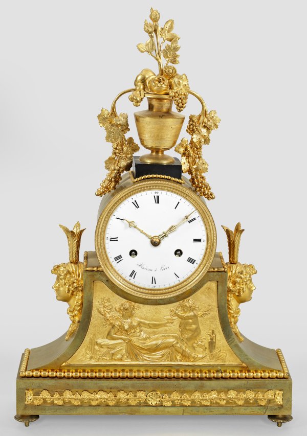 Bronze, vergoldet. Über querrechteckig angelegtem Sockel mit Perlstabfries geschweift ansteigender Korpus, seitlich mit plastischen Maskarons. In der Front erhaben reliefierte Darstellung einer Bacchantin. Profilgerahmtes Emailzifferblatt, bez. Marcon à Paris. Große Vasenbekrönung mit üppigen Weinreben und Rosenblüten. Pendulenwerk mit Fadenaufhängung sowie Halbstundenschlag auf Glocke. H. 47,5 cm. 31,5 cm x 11 cm.