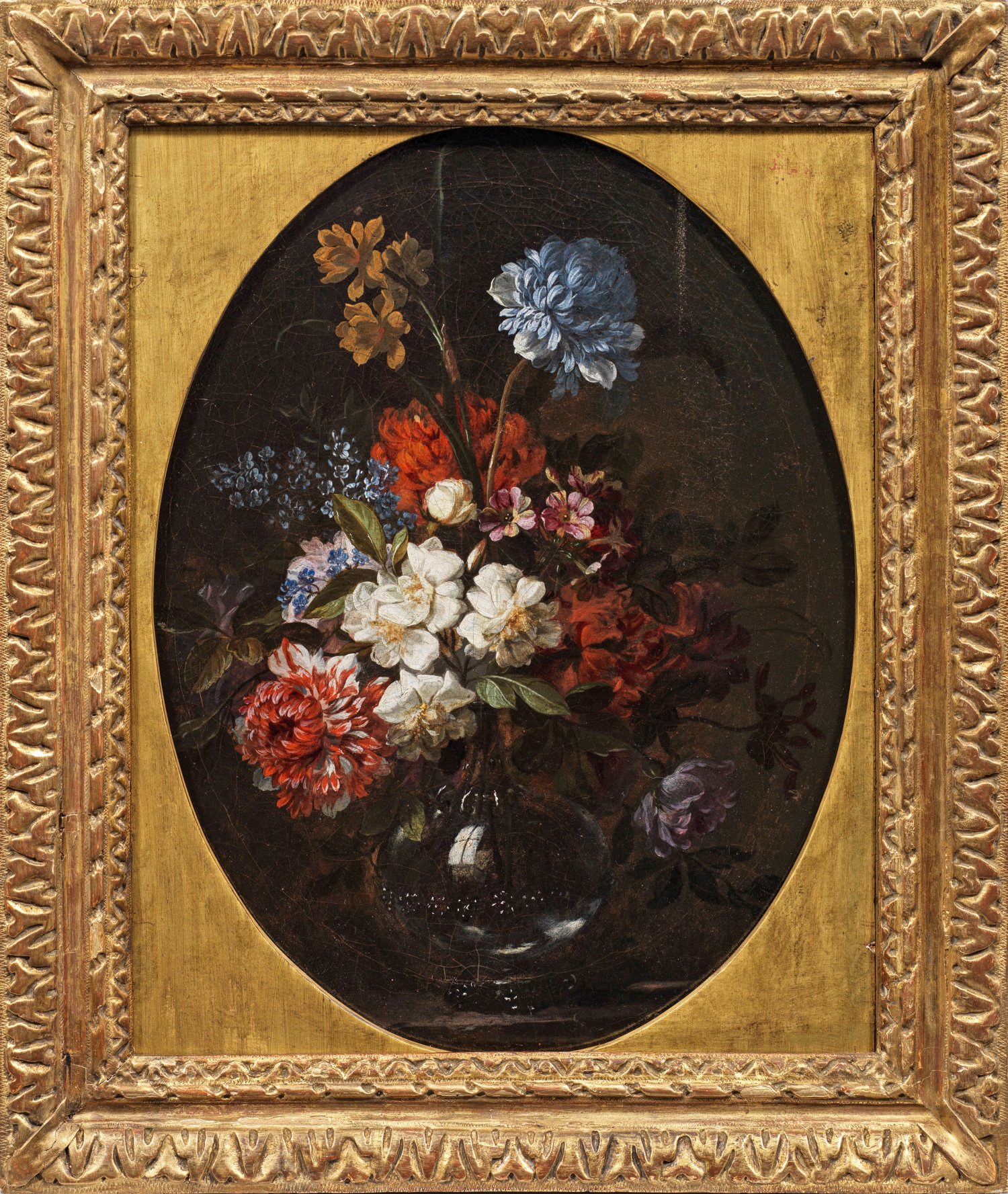 In einer gläsernen Vase arrangierter Strauß aus Tulpen, Päonien, Christröschen und verschiedenen Frühlingsblühern vor dunklem, neutralem Grund. Stil- und motivtypisches Blumenstück Monnoyers mit duftig gemalten, effektvoll leuchtenden Blüten. Monnoyer ging um 1650 nach Paris, wo er mit Charles Le Brun für Dekorationen königlicher Paläste und Schlösser kooperativ tätig war. Nachdem ihn 1665 die Akademie aufgenommen hatte, stellte er 1673 im Salon vier Blumenstillleben aus und reüssierte schnell als ein Meister auf diesem Gebiet. Monnoyer war ein favorisierter Künstler des Sonnenkönigs, der eine Sammlung seiner Gemälde besaß. Öl/Lwd.; doubl.; 44 cm x 35 cm. Rahmen.