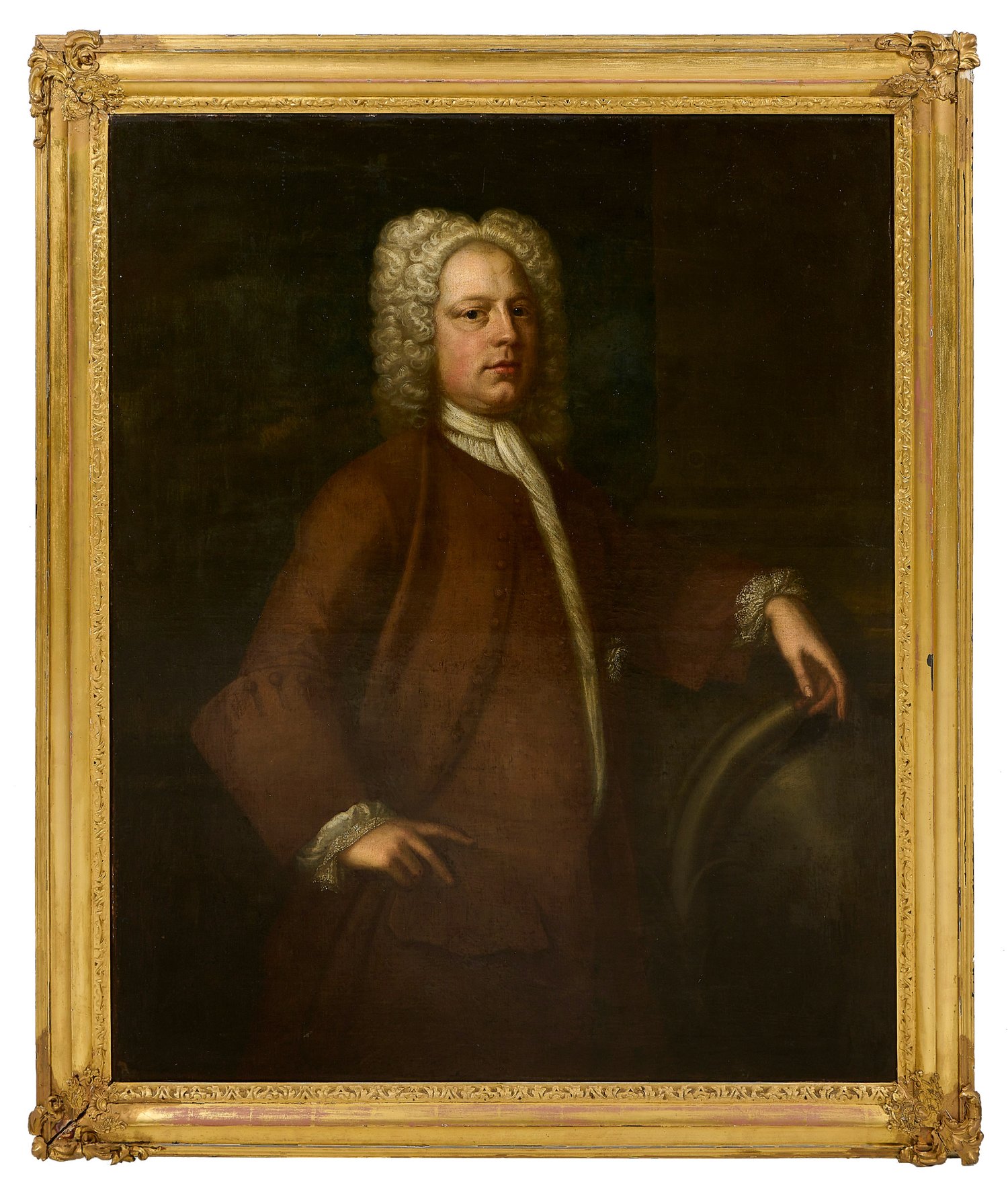Das repräsentativ gemalte, lebensgroße Hüftstück zeigt einen Herren mittleren Alters im Halbprofil mit weiß gepuderter Allongeperücke, gewandet in ein rotbraunes Justaucorps, das darunter liegende weiße Hemd mit feinen Spitzenmanschetten. In lässiger, selbstbewusster, weltgewandter Pose hält er seine linke Hand über einen Globus, während er seine rechte Hand an die Hüfte gelegt hat. Zu den englischen Malern, die als Künstler dieses qualitätvollen Porträts in Frage kommen zählen u. a. Michael Dahl (1659 - 1743), Jonathan Richardson (1665 - 1745), Thomas Hudson (1701 - 1779), Joseph Highmore (1692 - 1780) und Thomas Frye (um 1710 - 1762) oder auch deren Umkreis. Öl/Lwd., doubl.; 128 cm x 103,5 cm. Rahmen.