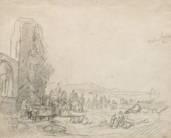Die mit kraftvollen, energischen Strichen ausgeführte Skizze Bürkels zeigt eine figurenreiche Szene an den Ruinen der Acqua Felice mit dem Brunnen neben der Porta Furba vor den Toren Roms, die 1585 unter Papst Sixtus V. fertiggestellt wurde. Sixtus V. hatte dort zugleich einen Brunnen errichten lassen, der auch unter dem Namen Fontana di Clemente bekannt ist, weil ihn Papst Clemens XII. 1733 restaurieren ließ. Auf ihrem Weg nach Rom war dieser ein beliebter Treff- und Haltepunkt für eine Rast von vielen Reisenden, Hirten und Viehhändlern. Bürkel hielt das Motiv sehr wahrscheinlich nach der Natur vor Ort auf einer seiner vier Italien-Reisen und längeren Rom-Aufenthalte (in 1827, 1831-1833, 1838 und 1853) fest. Bürkel schilderte das Thema auch in mehreren Gemälden, doch ist die vorliegende Skizze kein Entwurf zu einem seiner bisher bekannt gewordenen Gemälde. Bleistift/Bütten. 32,5 cm x 40,5 cm. Rahmen.