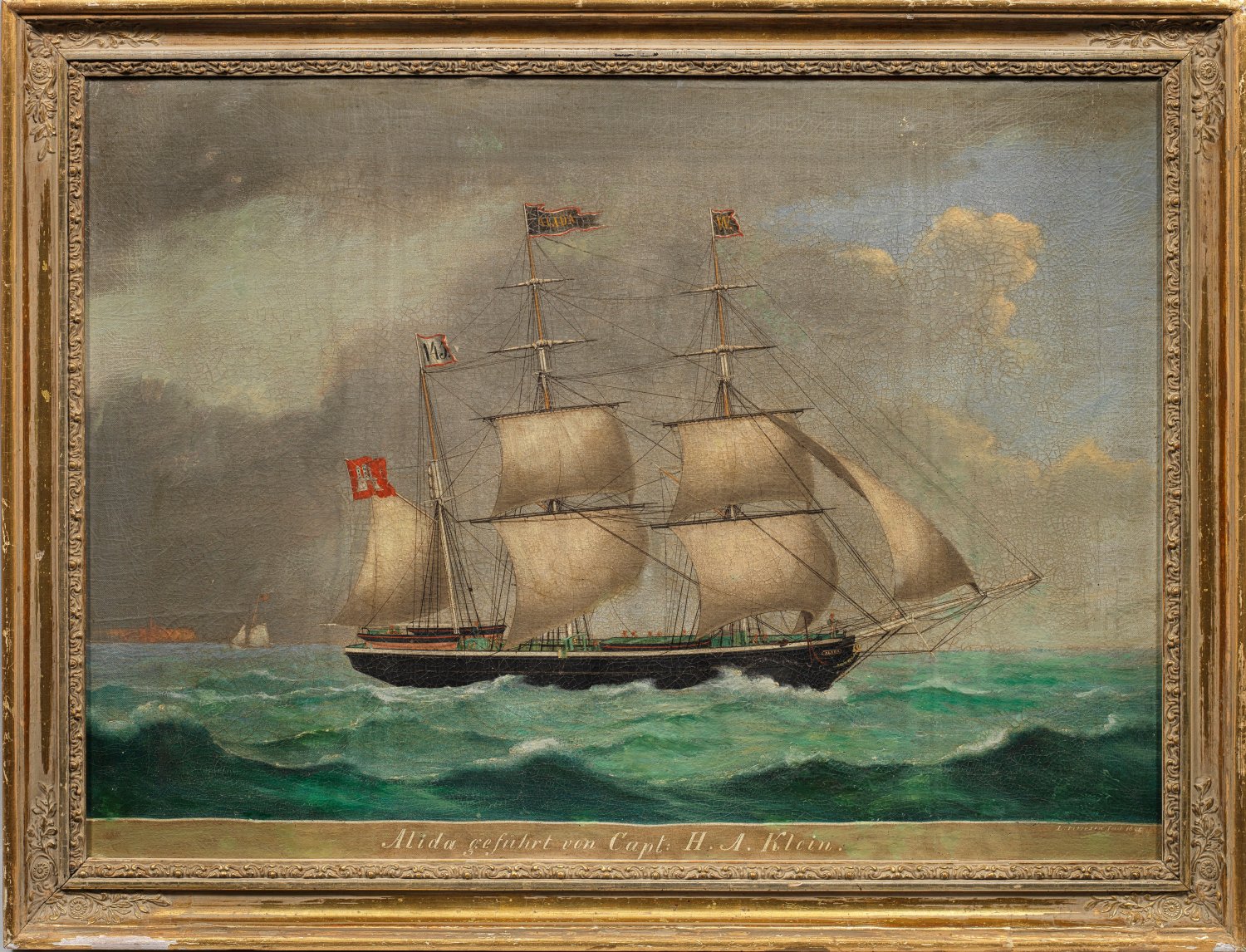 Schiffsportät der Dreimastbark unter Hamburger Flagge, mit Reedereiflagge "W" und weiterer Flagge mit Nr. "145". Lorenz Petersen, Sohn eines Seemannes, war seit 1830 in Altona tätig, wo er für Kapitäne, Besitzer und Reedereien von Schiffen zahlreiche Schiffsporträts schuf. Bis 1858 malte Petersen seine Marinebilder allein, von 1858 bis 1869 mit seinem Halbbruder Peter Christian Holm (1823 - 1888). Öl/Lwd., auf Hartfaser kaschiert. R. u. sign. u. dat. 1848. 47 cm x 64 cm. Rahmen.