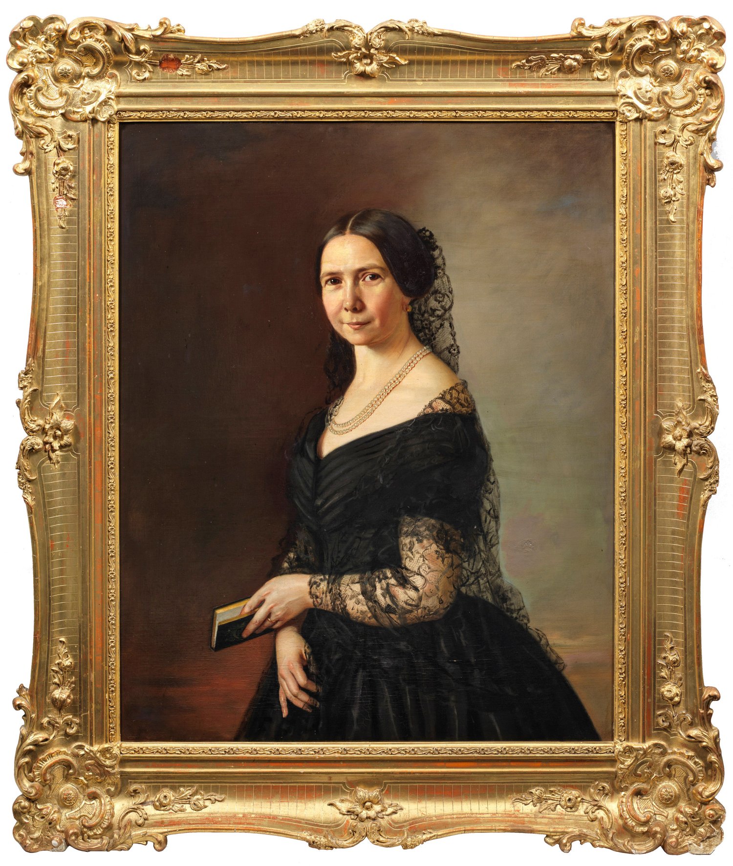 Repräsentatives, feinflüssig gemaltes, künstlerisch herausragendes Bildnis einer vornehmen Dame im Halbprofil, gewandet in ein schwarzes Kleid und eine feine, schwarze Spitzenstola, die effektvoll in transparenter Weise ihre Unterarme und einen Teil ihrer Schulter bedeckt. Das Gemälde zeigt die hohe Kunst der Wiener Porträtmalerei der Biedermeier-Zeit, in der Künstler wie Friedrich von Amerling, Ferdinand Georg Waldmüller und Josef Danhauser zu den herausragenden und prägenden Künstlerpersönlichkeiten gehörten. Öl/Lwd.; 100 cm x 82 cm. Rahmen.