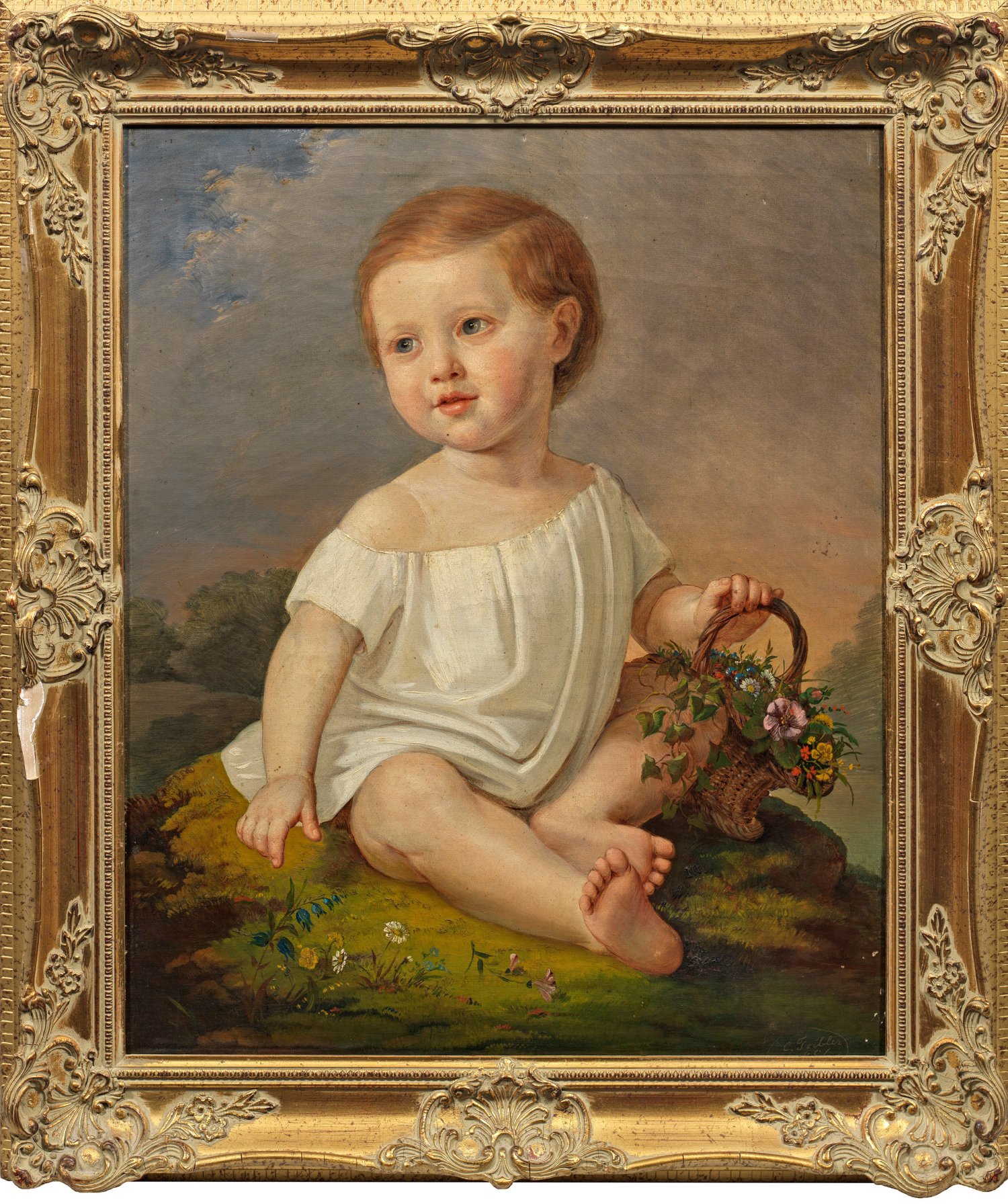 Einfühlsames, spätbiedermeierliches Bildnis des auf einem kleinen Wiesenstück sitzenden Kindes. Teibler spezialisierte sich früh auf die Porträtmalerei. Er war 1835-1841 Schüler des Porzellan- und Porträtmalers Joseph Kieslings, überdies studierte er seit 1837 an der Akademie der bildenden Künste in Wien bei Karl Gsellhofer, Anton Petter, Leopold Kupelwieser und Johann Ender. Öl/Lwd.; R. u. sign. u. dat. 1851. 62 cm x 50 cm. Rahmen.