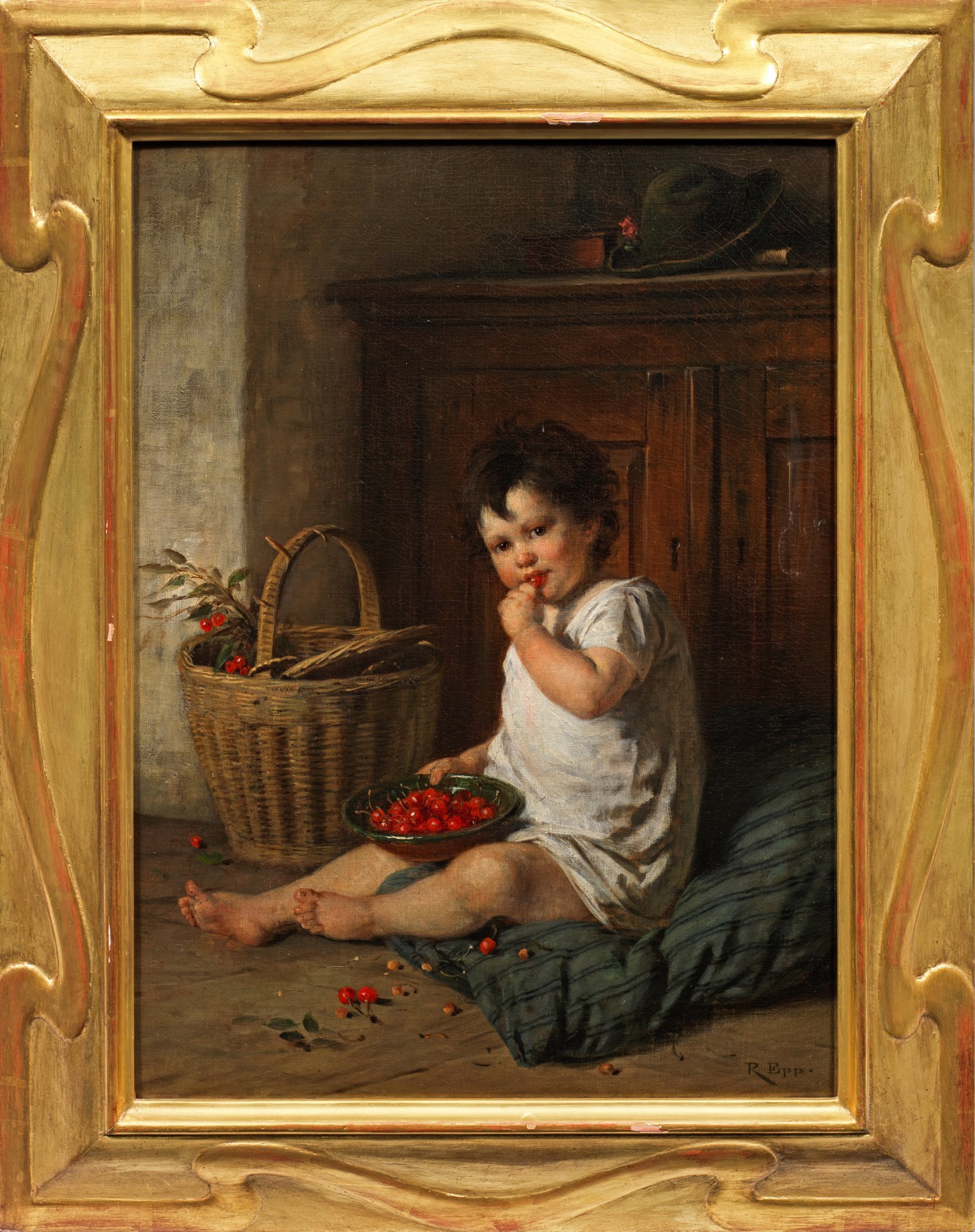 Bekleidet mit einem weißen Hemdchen sitzt der pausbäckige, dunkle Lockenschopf auf einem Kissen in der Stube, blickt den Betrachter mit seinen rosigen Wangen unschuldig an und nascht genüsslich aus einer Schale mit leuchtendroten Kirschen, während sich zu seinen Füßen bereits einige abgenagte Kirschkerne und abgebrochene Fruchtstiele sammeln. Liebevoll charakterisiertes, reizvolles Genrebild Epps, der an der Karlsruher Akademie bei Johann Wilhelm Schirmer und Ludwig Des Coudres studierte und 1863 nach München ging, wo er durch seine subtilen, deliziösen Genregemälde mit ihren lebensnah geschilderten Figuren in Interieurs rasch zu einem auch international gefragten Maler wurde. Öl/Lwd., kaschiert auf Platte. R. u. sign.; 61 cm x 46 cm. Rahmen.