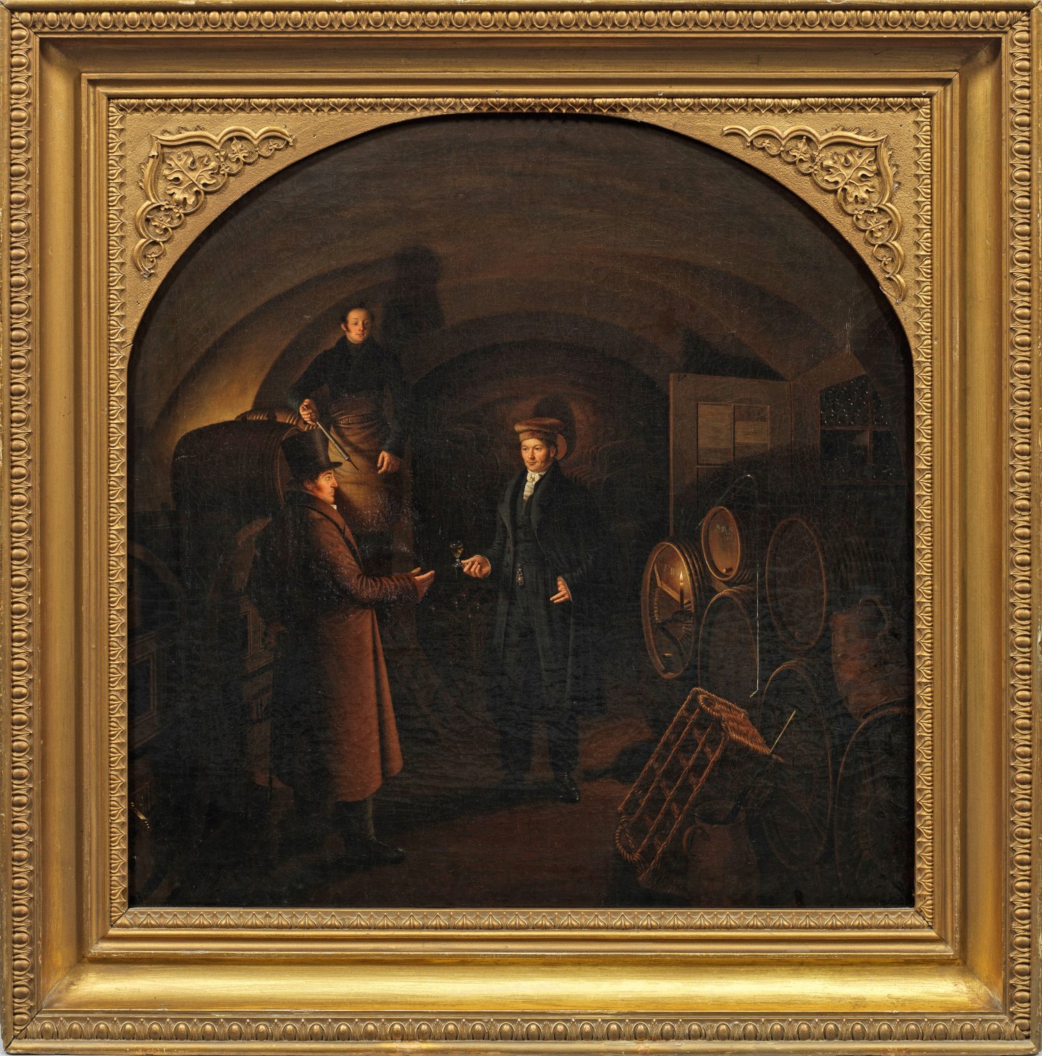 In fein lasierender Malweise ausgeführte Darstellung der Romantik mit effektvoller Szene im Kerzenschein, bei der ein junger Weinhändler einem vornehmen Kunden ein gefülltes Weinglas reicht, während der Kellermeister mit einem Probeheber in der Hand den beiden zuschaut. Seltenes, künstlerisch herausragendes Werk des früh verstorbenen Genre- und Porträtmalers der Biedermeier-Zeit. Schroeter studierte 1811-1817 an der Kunstakademie in Leipzig und anschließend 1817-1819 an der Kunstakademie in Dresden. 1826 übersiedelte er von Leipzig nach Berlin und wandte sich verstärkt der Genremalerei zu. Noch im selben Jahr zeigte Schröter auf der Berliner Akademie-Ausstellung erstmals einige seiner Arbeiten. Um 1830 war Schroeter einer der ersten und bekanntesten Genremaler, noch bevor sich die Genremalerei an der Akademie in Düsseldorf durchsetzen konnte. Öl/Lwd.; L. u. sign.; 58 cm x 58 cm. Original-Rahmen.