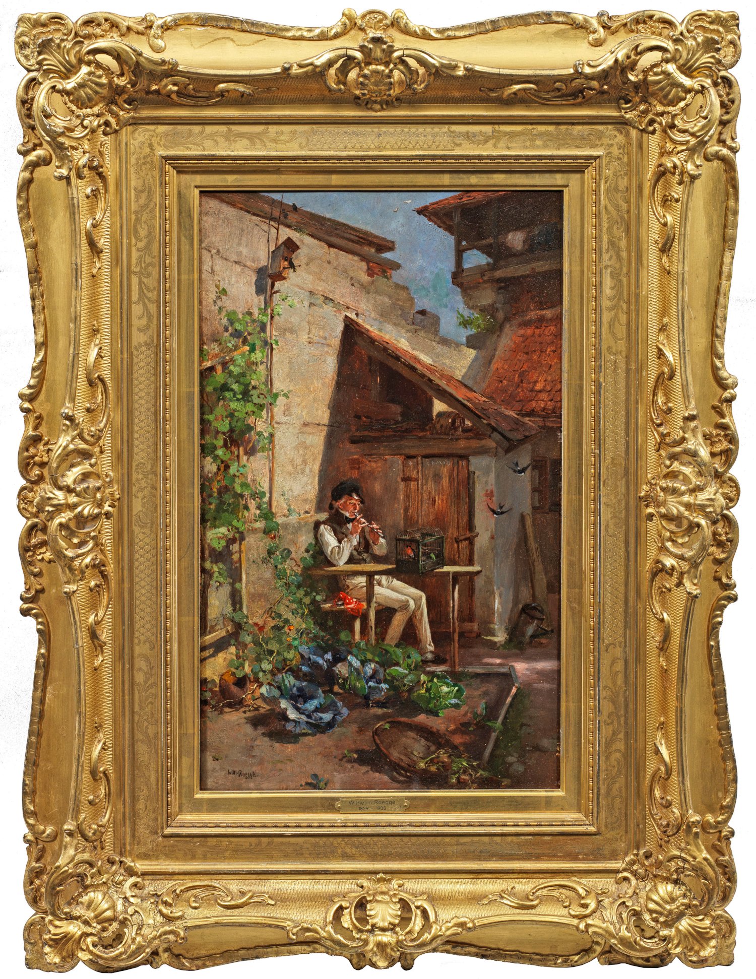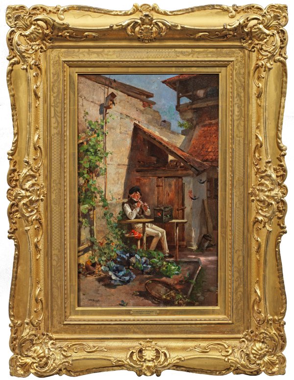 Feinflüssig gemalte, erzählerische Darstellung mit feinfühliger Figurencharakterisierung eines auf einer Flöte musizierenden Studenten in einem Hinterhof nebst Vogelkäfig, Obst-und Gemüsebeet sitzend. Motivtypisches Werk des Münchener Genre- und Historienmalers, der an der Münchener Akademie bei Philipp v. Foltz sowie bei Joseph Kehren in Düsseldorf studierte. Für König Ludwig II. von Bayern schuf er Fresken in den Schlössern von Linderhof und Herrenchiemsee. Öl/Holztafel. L. u. sign.; 45 cm x 26,5 cm. Original-Rahmen.