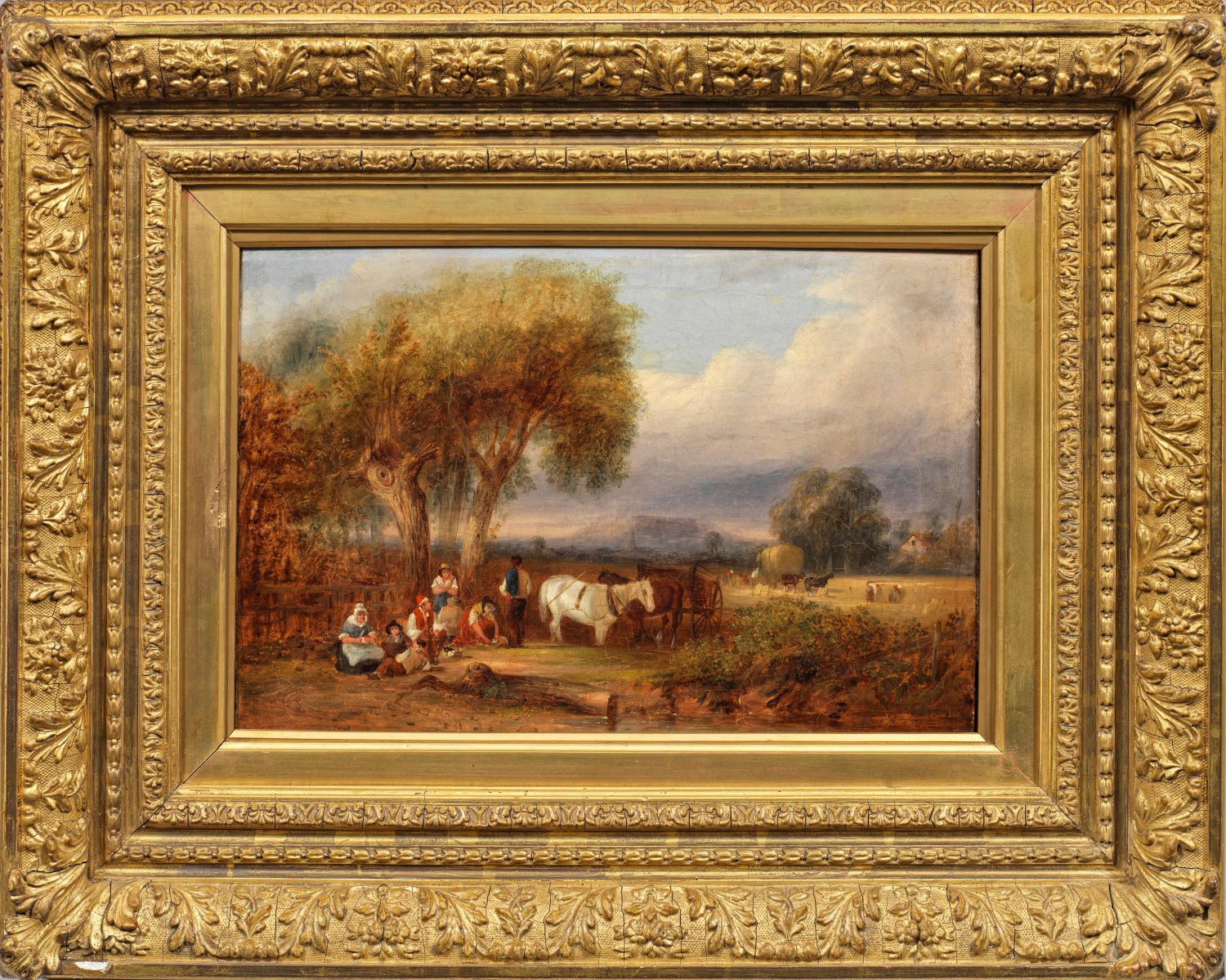 Stimmungsvolle, fein lasierend gemalte Ernteszene Shayers, der ein gleichermaßen begabter Landschafts- und Figurenmaler war. Über 400 Gemälde stellte er in der Royal Academy, Society of British Artists und British Institution aus; Werke besitzen die Tate Gallery und das Metropolitan Museum. Öl/Lwd. (Malwarenstempel von Thomas Miller, London). R. u. sign. u. dat. 1848. Verso Künstler-Bez. mit Betitelung u. Ortsangabe Southampton. 30,5 cm x 43,5 cm. Rahmen.