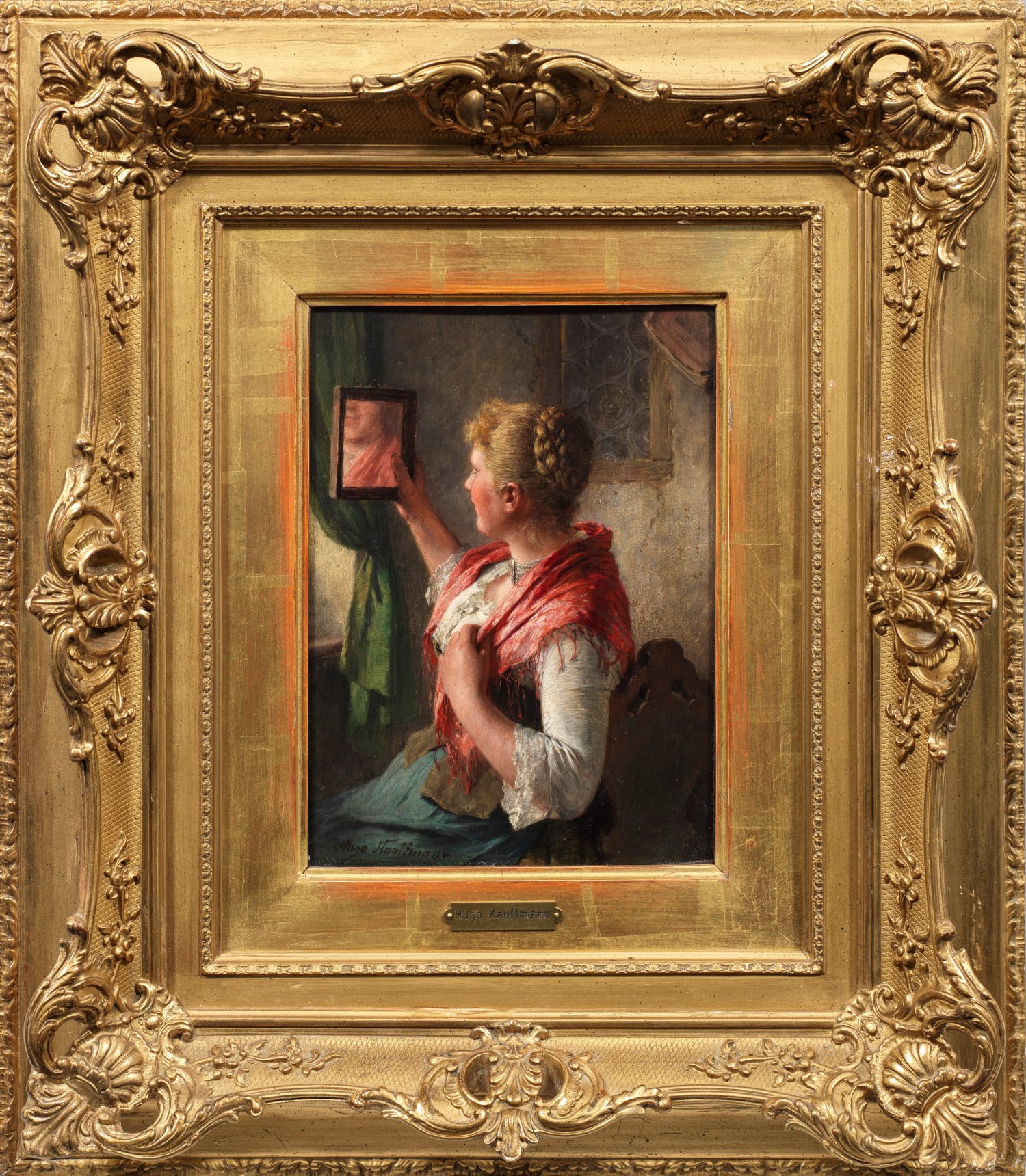Fein gemaltes, charakteristisches Kabinettbild Hugo Kauffmanns, Sohn des bedeutenden Hamburger Genre- und Landschaftsmalers Hermann Kauffmann (1808 - 1889). 1861-1863 studierte er am Städel'schen Kunstinstitut in Frankfurt a. M. und war ab 1871 in München und Prien ansässig. In seinem Oeuvre zeigt Hugo Kauffmann seine Begabung als herausragender Schilderer humoristischer, subtil beobachteter Szenen aus dem bayerischen Volksleben voll erzählerischer Kraft. Meist komponierte er diese in Wirts- und Bauernstuben mit feinem Gefühl für Details und Lichtstimmungen. Überdies schuf er eine Reihe ländlicher Bildnisse, mit Vorliebe Porträts von Bauernmädchen in Tracht. Öl/Mahagonitafel. L. u. sign.; Verso Stempel der Kunstsammlung Wolf Anton von Manner, Siegel mit Wappen, Papier.Etikett mit Nr. 103 u. Künstler-Bez. "Hugo Kaufmann". 24,5 cm x 18,5 cm. Rahmen.