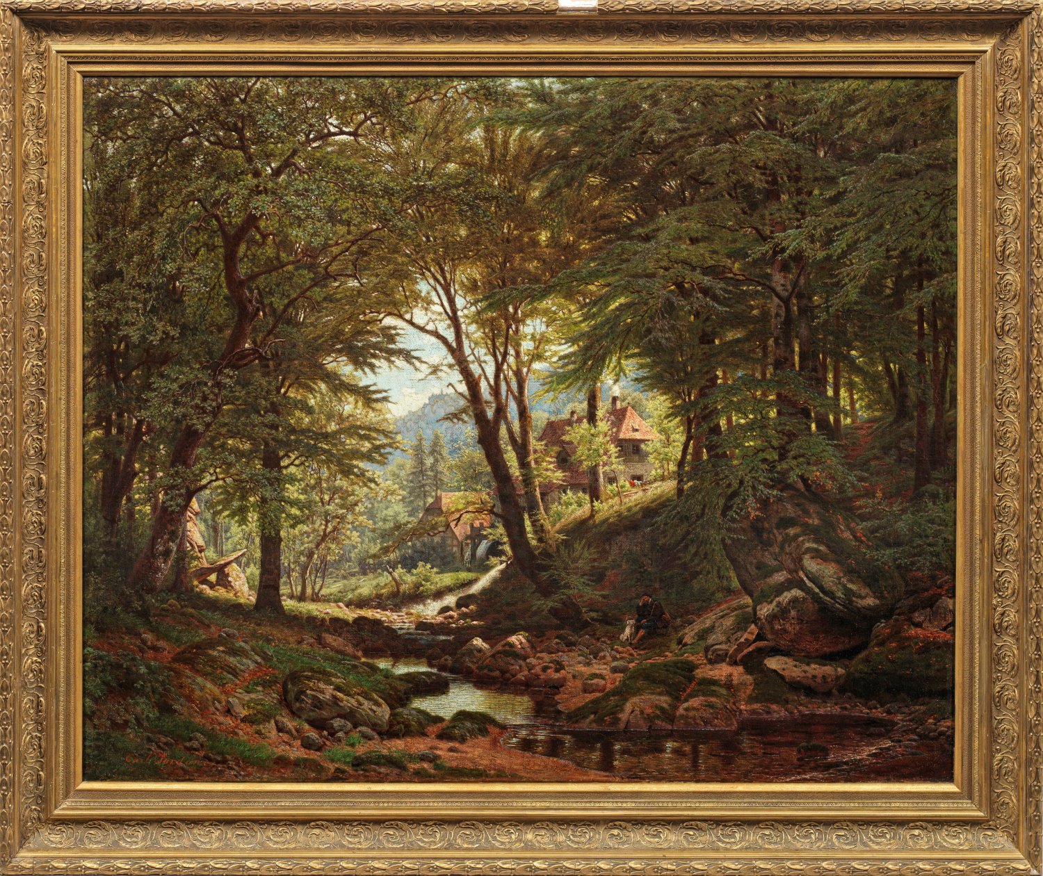 Blick auf einen Buchenwald mit Bachlauf, an dem ein Mann mit seinem Hund rastet, im sonnenbeschienenen Mittelgrund eine Wassermühle und ein größeres Haus. Spätromantisches, stimmungsvolles Werk des Landschaftsmalers, der 1868 eine "Abendlandschaft" mit Motiv aus Walkenried auf der Akademie-Ausstellung in Berlin zeigte; eine weitere "Harzlandschaft" von 1871 befand sich in der Herzoglichen Galerie in Gotha. Öl/Lwd., doubl.; L. u. sign.; 78 cm x 96,5 cm. Rahmen.