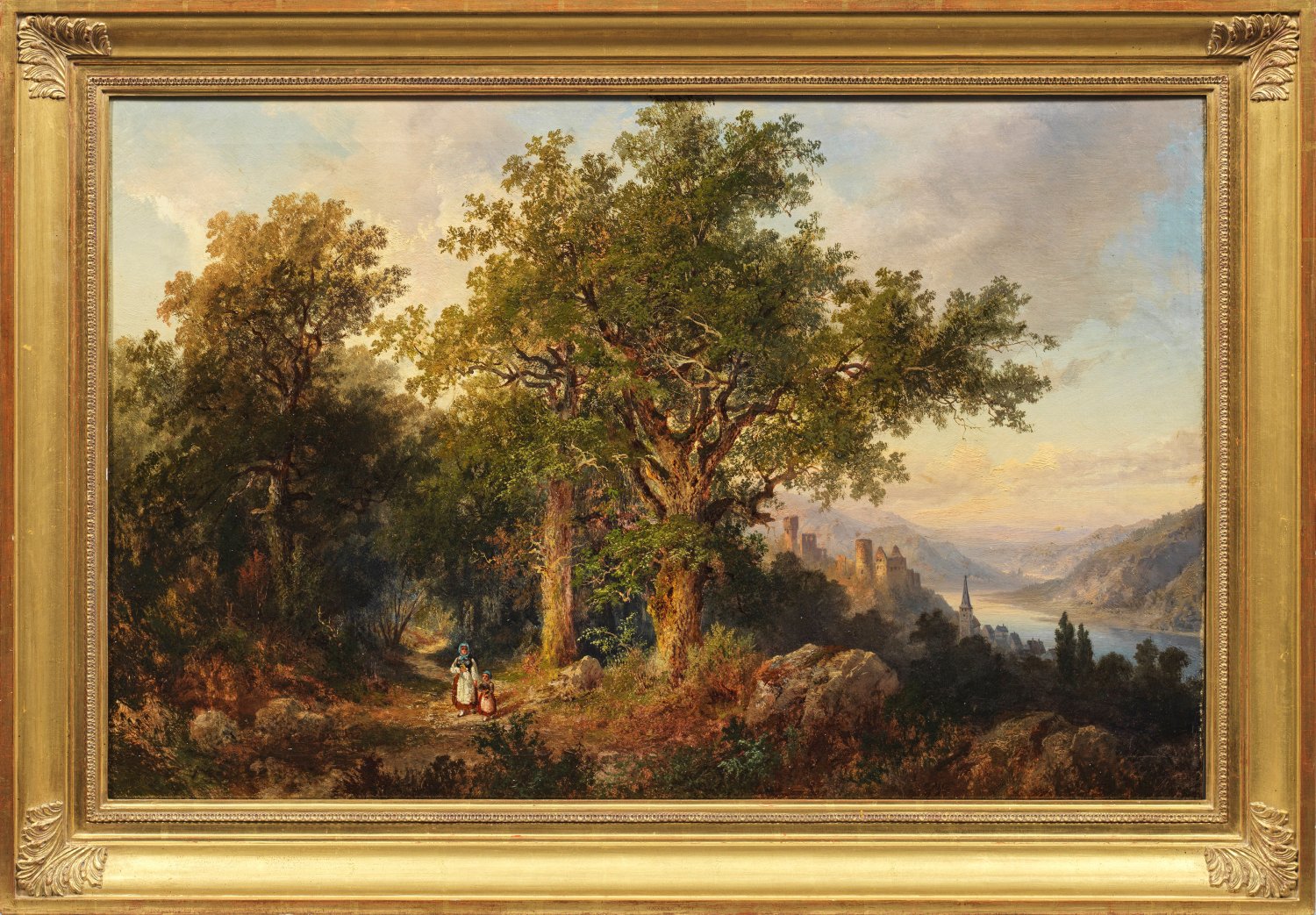 Blick von einer, mit alten Eichen bestandenen Anhöhe, auf das Tal mit einer mittelalterlichen Burg und Stadt im Abendlicht, im Vordergrund belebt durch eine Staffage aus zwei Mädchen auf einem Waldweg. Im warmtonigen Kolorit gemalte Stimmungslandschaft. Benne(c)kenstein war auf den Berliner Akademie-Ausstellungen 1856, 1858, 1862, 1864, 1870 und 1877 vertreten. Wie die Titel seiner Gemälde annehmen lassen, unternahm Benne(c)kenstein Studienreisen an den Rhein und die Mosel, als auch in den oberbayerischen Alpenraum sowie nach Tirol, in den Harz und nach Frankreich. Öl/Lwd.; R. u. sign. u. dat. 1874. 62 cm x 88 cm. Rahmen.