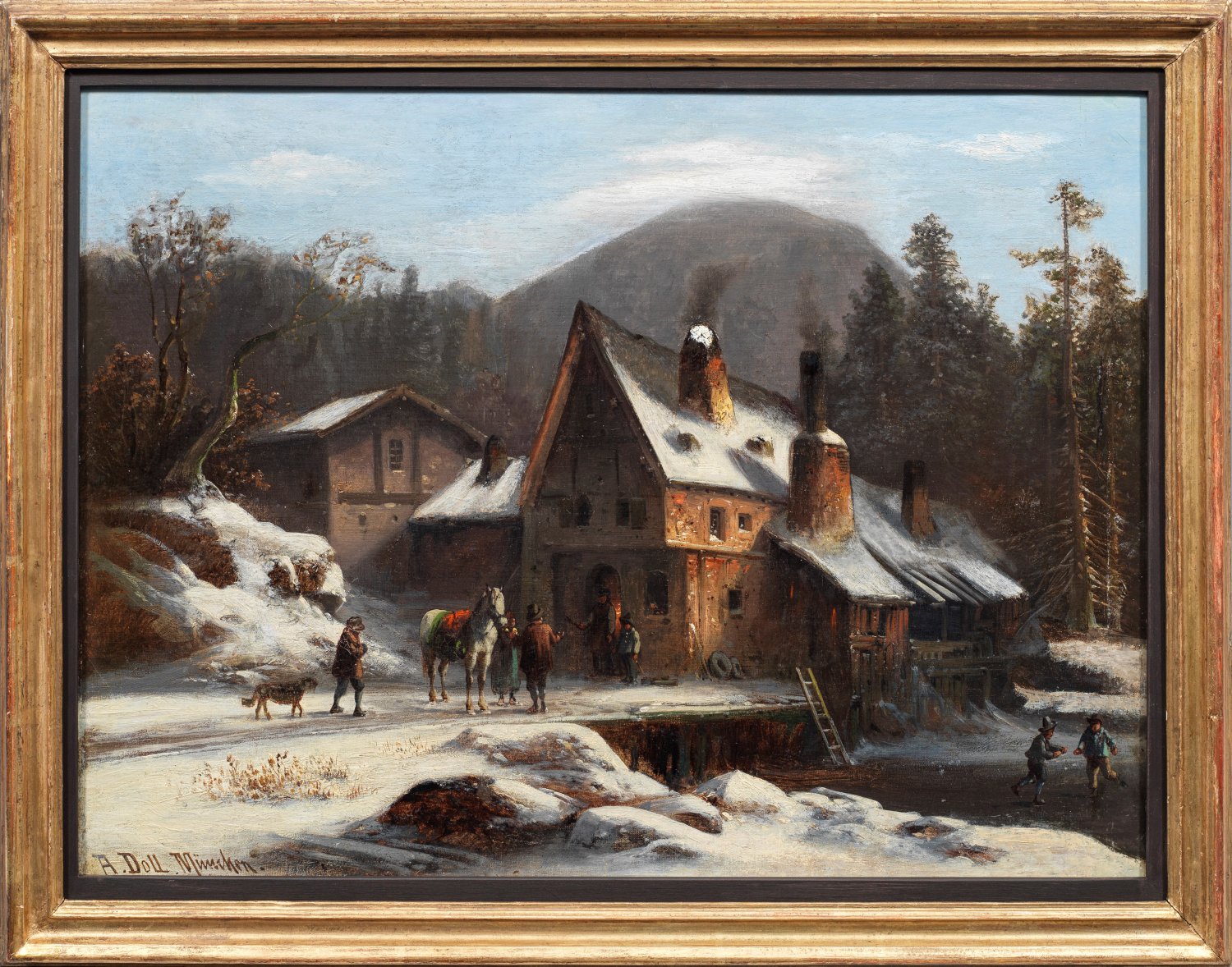 Blick auf eine verschneite, bergige Landschaft mit alter, pittoresker Schmiede an einem zugefrorenem Gewässer, auf dem Kinder herumtollen, vor der Schmiede mit geöffneter Tür eine Figurengruppe und ein Pferd. Ein Hauptsujet Dolls waren Winterlandschaften mit idyllischen Dörfern und Eisläufern. Öl/Lwd., doubl.; L. u. sign. mit Ortsangabe München. 45 cm x 62 cm. Rahmen.