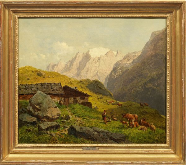 Vor monumentalem, schneebedecktem Bergmassiv die sommerlich grüne Almwiese mit Hütte, davor die Sennerin mit einem Knaben und ihrer Rinder- und Schafherde. In filigraner Lasurmalerei ausgeführte, äußerst atmosphärisch inszenierte Gebirgslandschaft Millners, der bei Julius Lange in München lernte und sich auf Stimmungslandschaften des Alpenraums spezialisierte, wofür er intensive Studien vor Ort betrieb. Öl/Lwd., doubliert. R. u. sign.; Verso schwer leserlich bez. mit Motivangaben, Künstlerbez., Ortsangabe München und Dat. 1885. 44 cm x 52 cm. Rahmen.