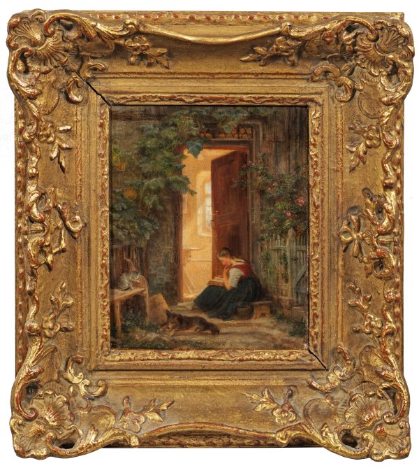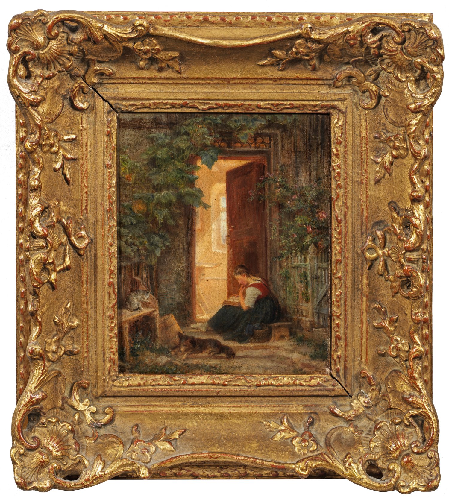 Im Hinterhof, mit zur lichtdurchfluteten Stube halb offenstehender Tür, auf einem Schemel ein junges Mädchen in ihre Lektüre versunken. Reizvolles, mit Liebe zum Detail gemaltes Genrebild des Düsseldorfer Malers, der in Stuttgart und München ausgebildet wurde. Öl/Lwd.; L. u. ligiert monogr. und dat. 1868 sowie verso sign., mit Ortsangabe Düsseldorf und nochmals dat.; 27 cm x 22 cm. Rahmen.
