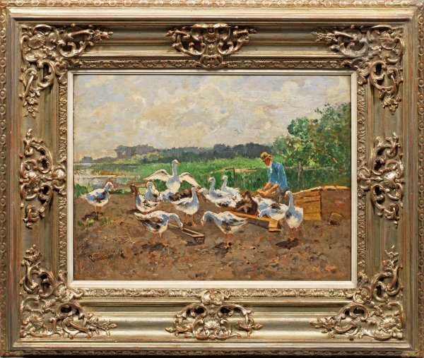 Unter duftig bewölktem Himmel am Ufer eines Sees befüllt ein Bauer die Futtertröge seiner Gänse, die sich sogleich schnatternd und Flügel schlagend auf die Körner stürzen. In leuchtendem Kolorit und effektvoller Lichtbehandlung angelegte Landschaftsimpression Poschingers, der sich auf Landschaften des idyllischen bayerischen Voralpenlandes spezialisierte. Hierbei zählen Motive an den Ufern des Starnberger Sees, der Osterseen oder des Chiemsees zu seinen beliebtesten Motiven, die er zumeist mit örtlichen Fischern, Bauern oder Tieren belebt. Der renommierte Maler der Münchner Schule, der bei Adolf Lier lernte, verstand es meisterlich die Sanftheit und Friedlichkeit der oberbayerischen Landschaften in frühimpressionistisch geprägter Plein-air-Malerei wiederzugeben. Öl/Masonit. L. u. sign.; 45 cm x 59 cm. Rahmen.